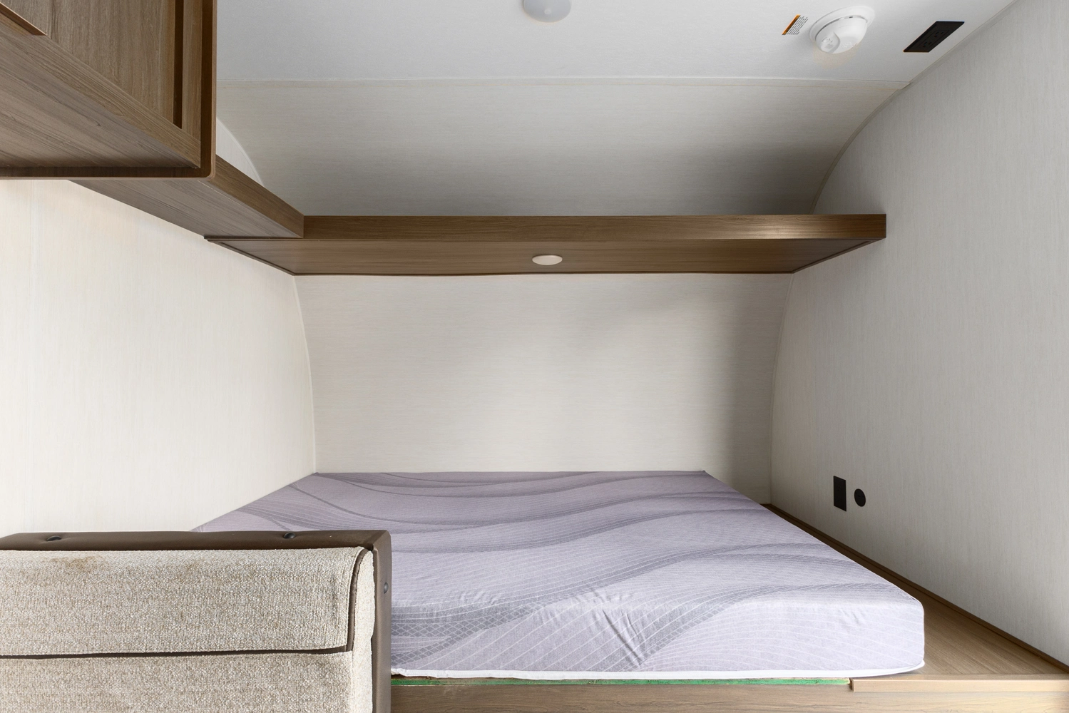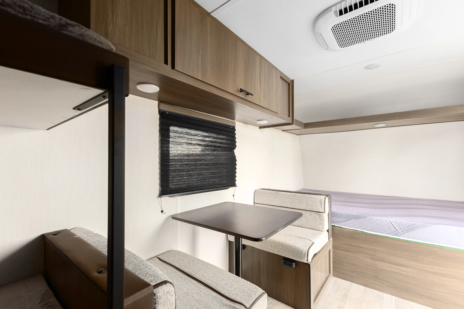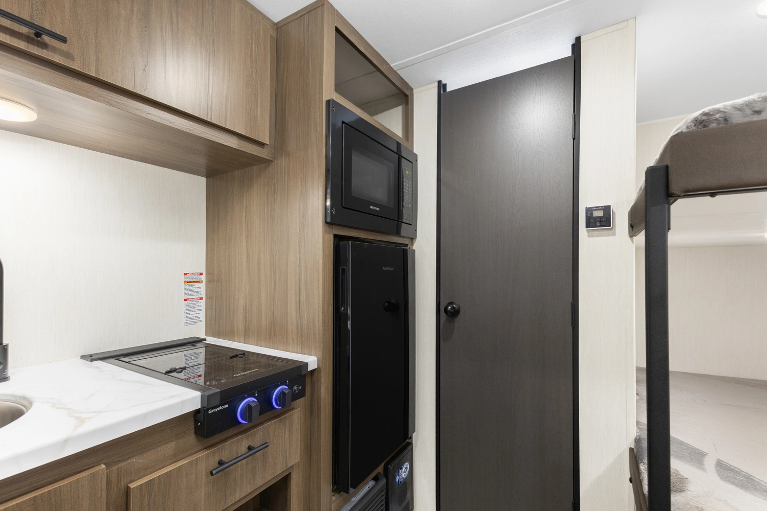 Looking for a lightweight travel trailer that's perfect for families? The Avenger 16BHX by Forest River makes great use of a 20ft 4in length with the ability to sleep up to five people! The Camp queen bed features a nightstand and nearby is a dinette that converts into an extra bed. The modern kitchen features a refrigerator, large stainless-steel sink, two-burner stovetop and a microwave. Near the rear bunk beds is a bathroom with a shower and toilet inside.