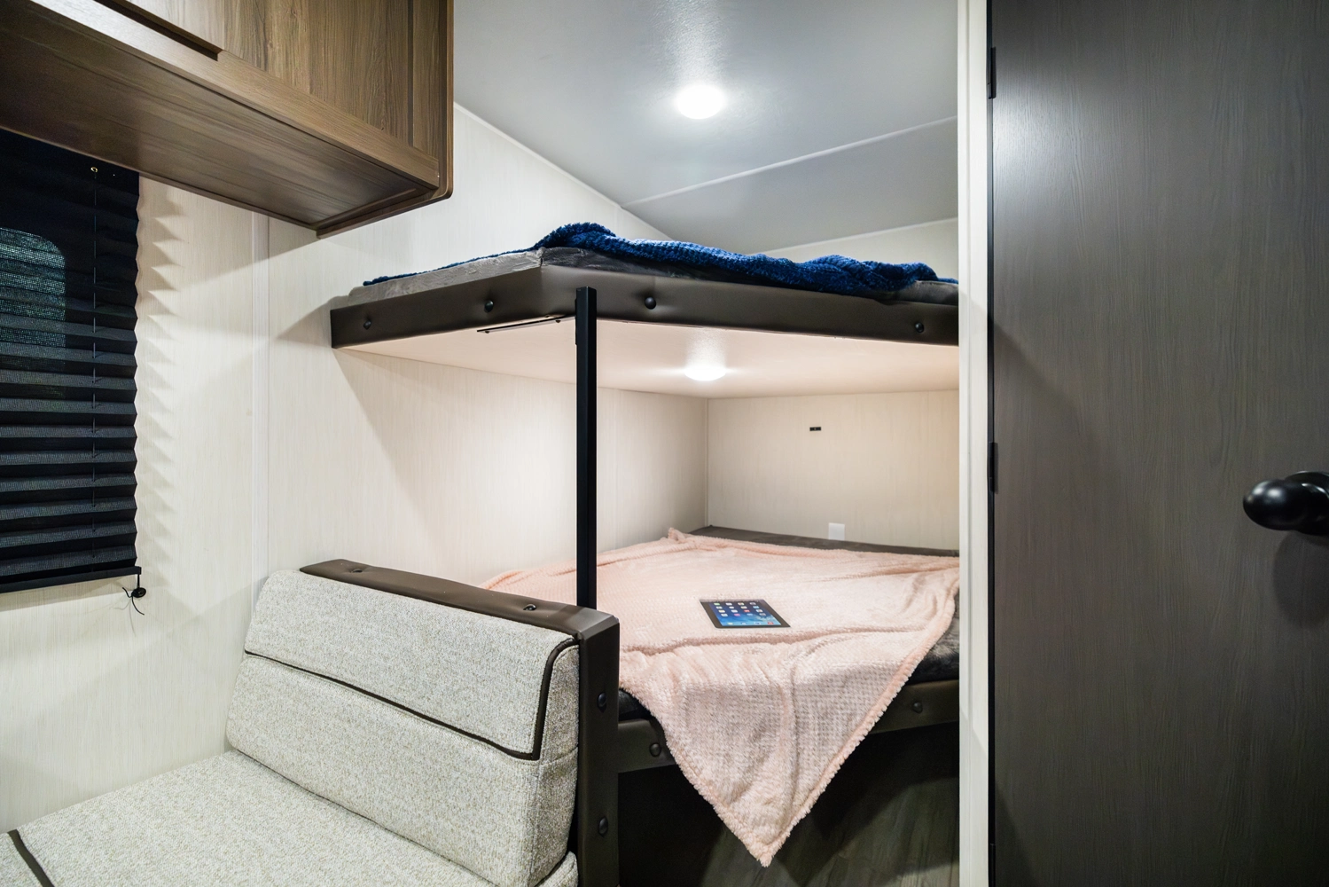 The 17DBX is packed with features. The Camp queen bed up front features a nightstand and shelf above. The kitchen provides a booth dinette, large farmhouse stainless steel sink, and modern appliances, while the rear bunkhouse gives you large double over double bunks for additional flexibility and comfort.