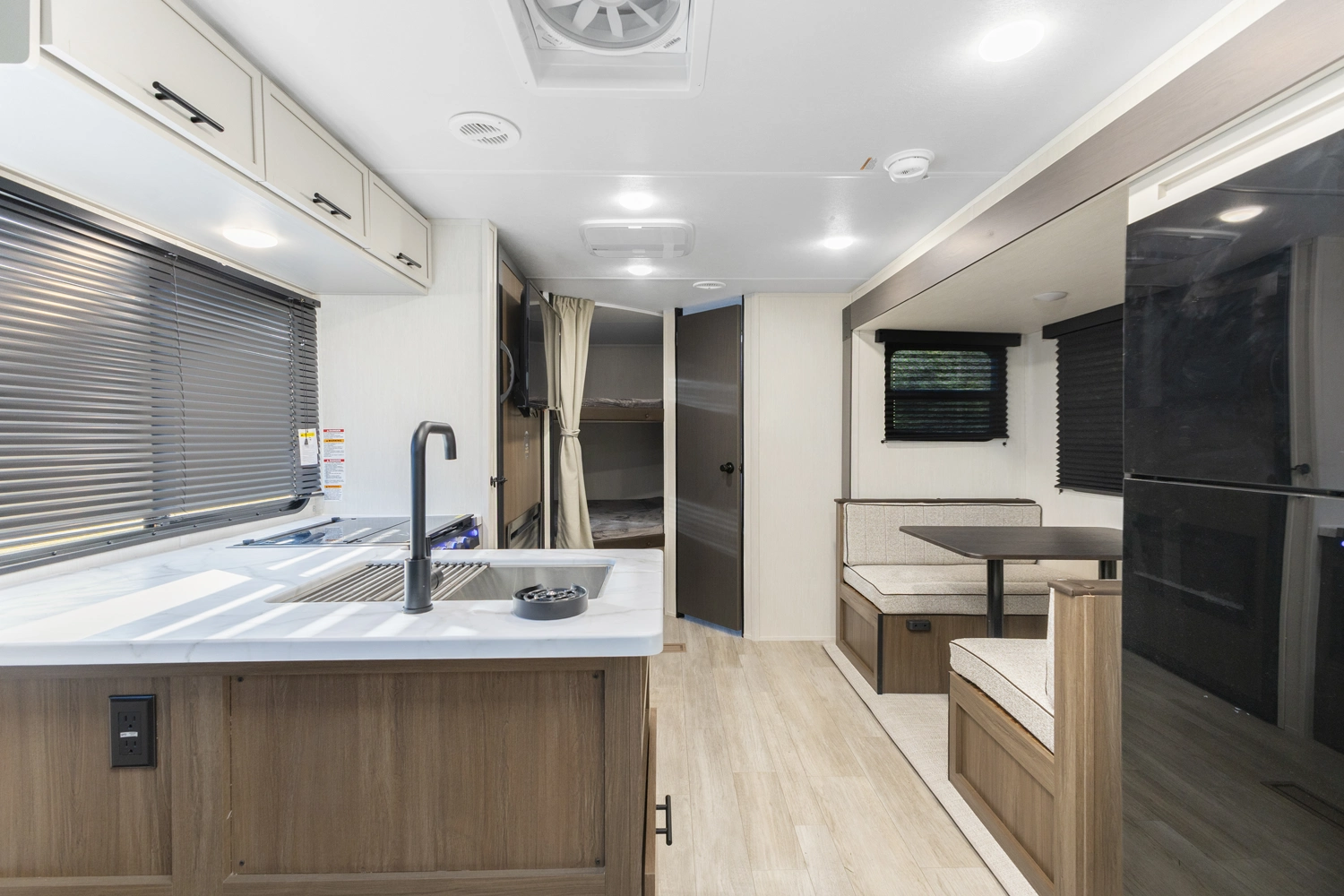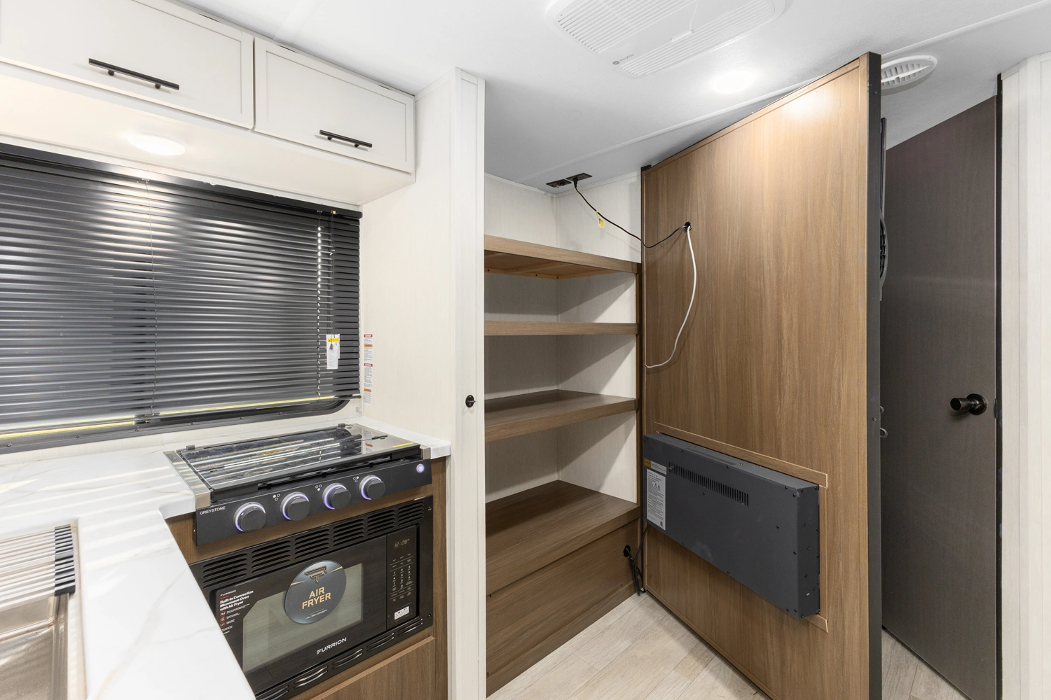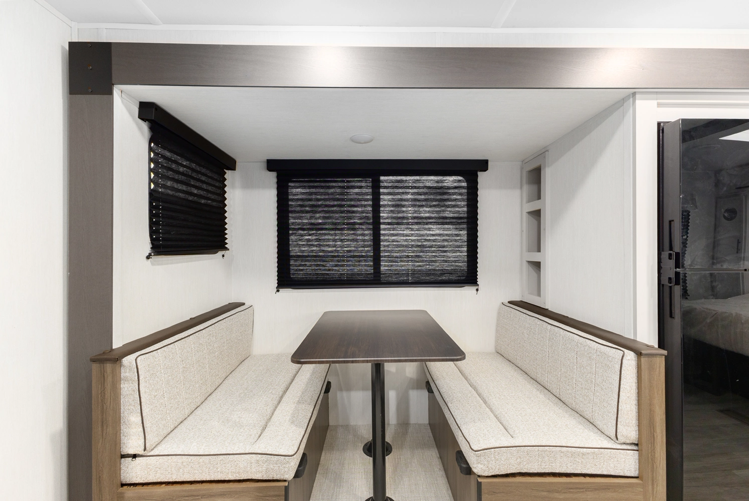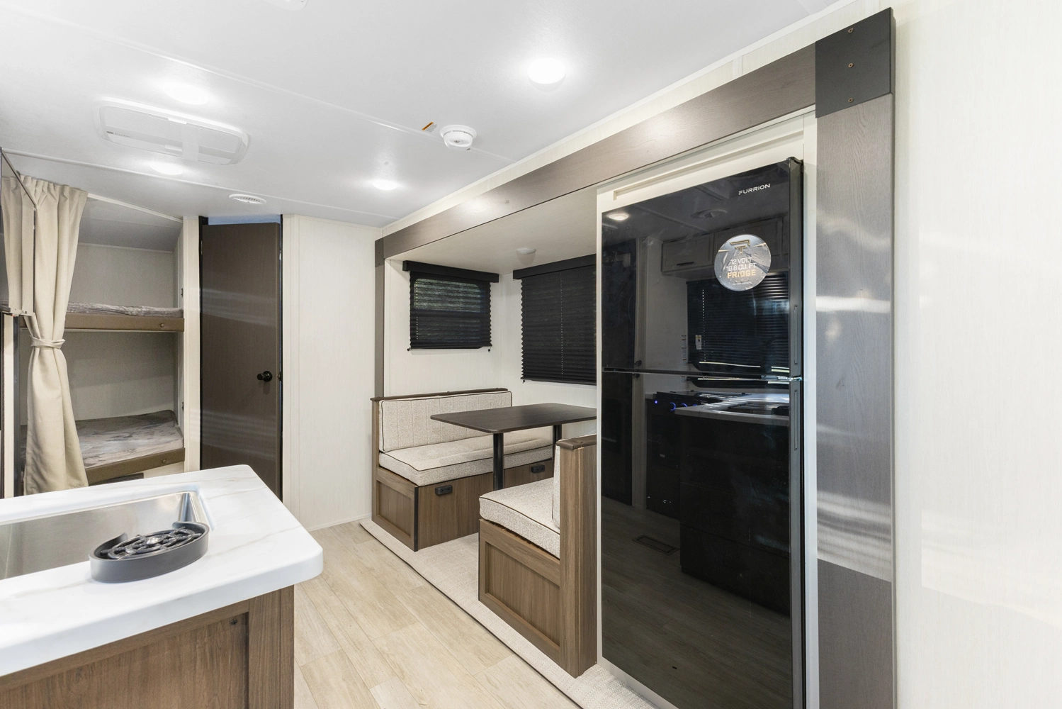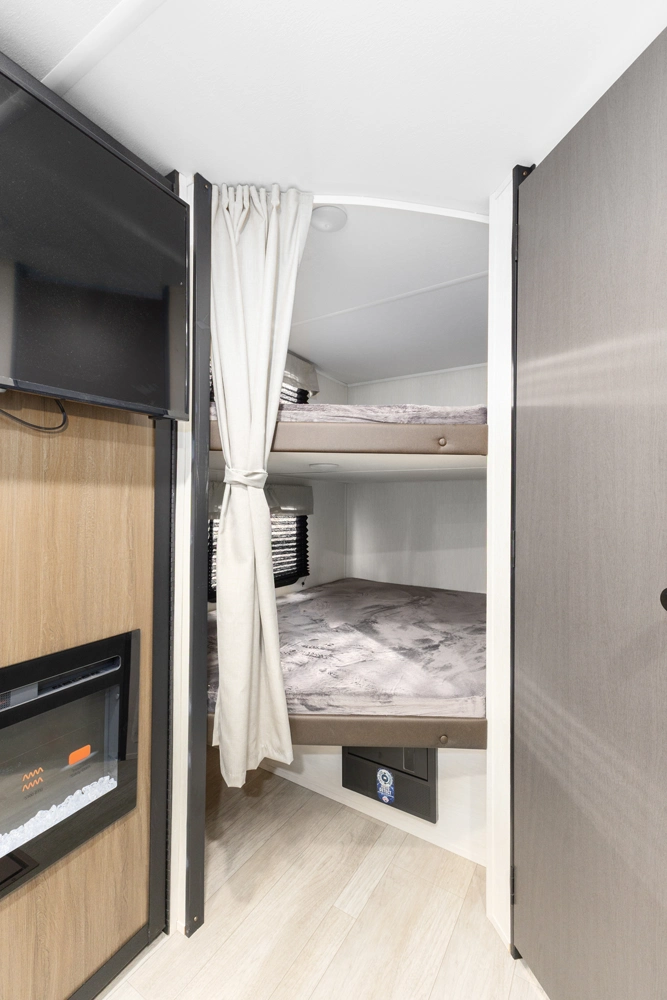 This Travel Trailer provides many areas for you and your guests to sleep. With double over double bunks in the rear, and a camp king bed in the bedroom, feel free to invite your friends and family. A booth dinette residing in the slideout provides extra storage space in the shelves as well as in the bench seats. A rear bathroom with a large shower grants you plenty of space. Furthermore, a hidden pantry behind the TV and fireplace that is great for hiding clothes, clutter and much more!