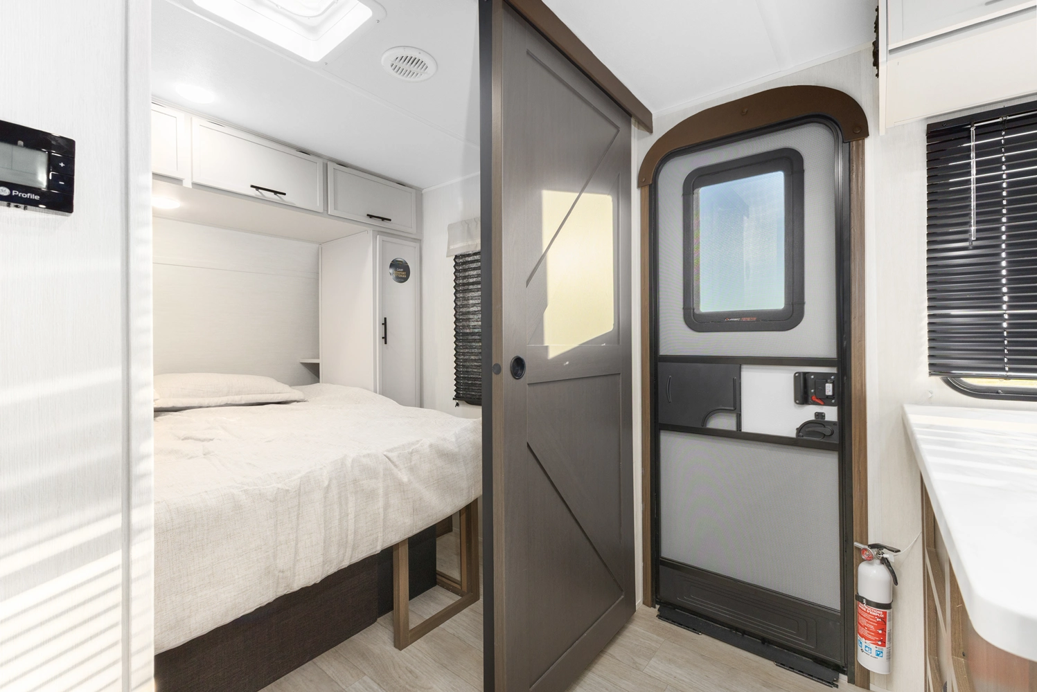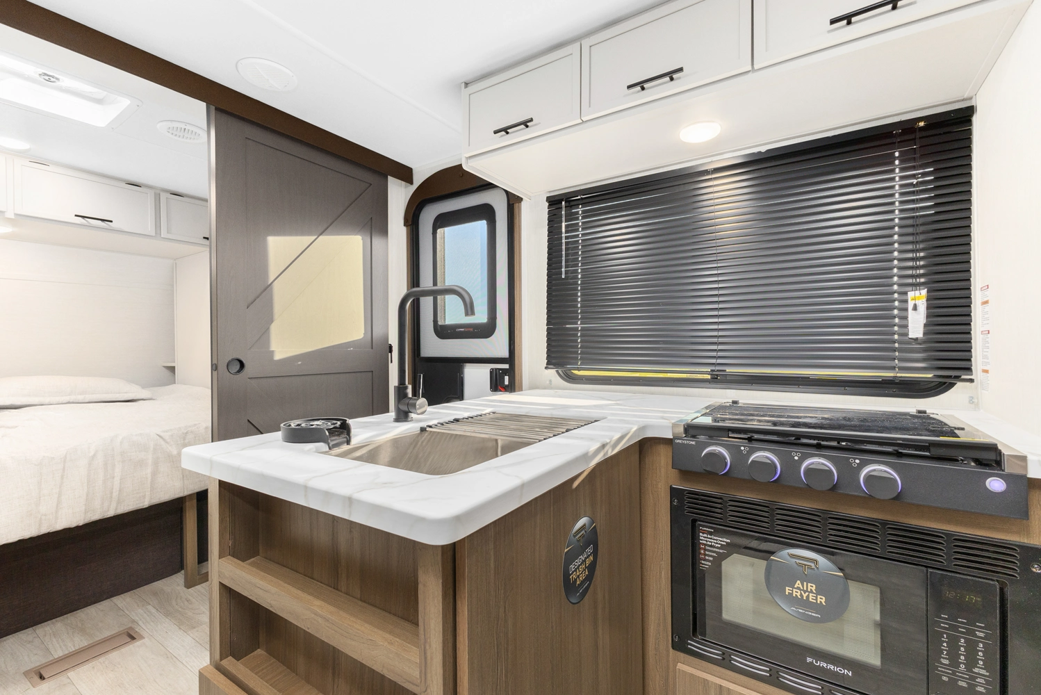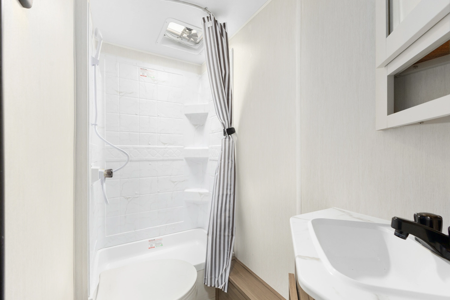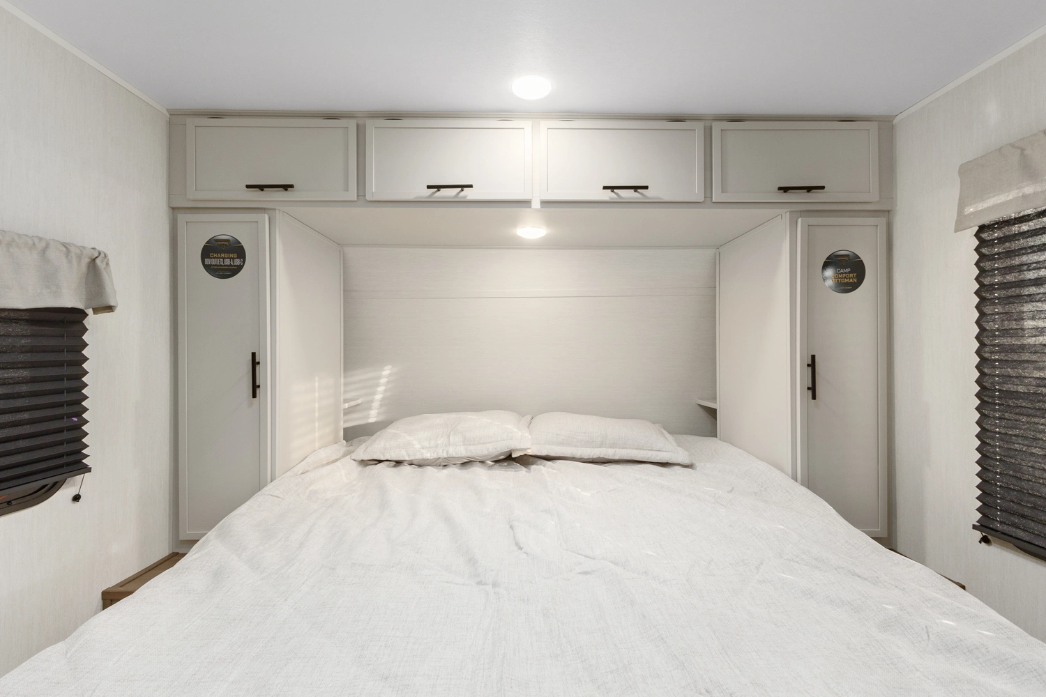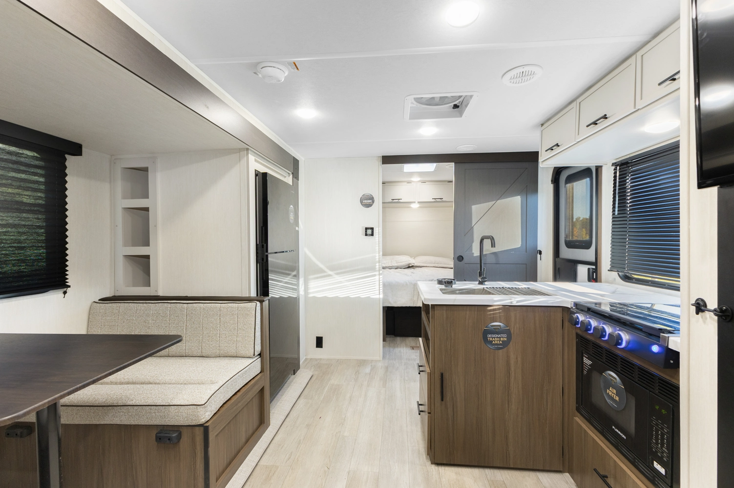 This Travel Trailer provides many areas for you and your guests to sleep. With double over double bunks in the rear, and a camp king bed in the bedroom, feel free to invite your friends and family. A booth dinette residing in the slideout provides extra storage space in the shelves as well as in the bench seats. A rear bathroom with a large shower grants you plenty of space. Furthermore, a hidden pantry behind the TV and fireplace that is great for hiding clothes, clutter and much more!