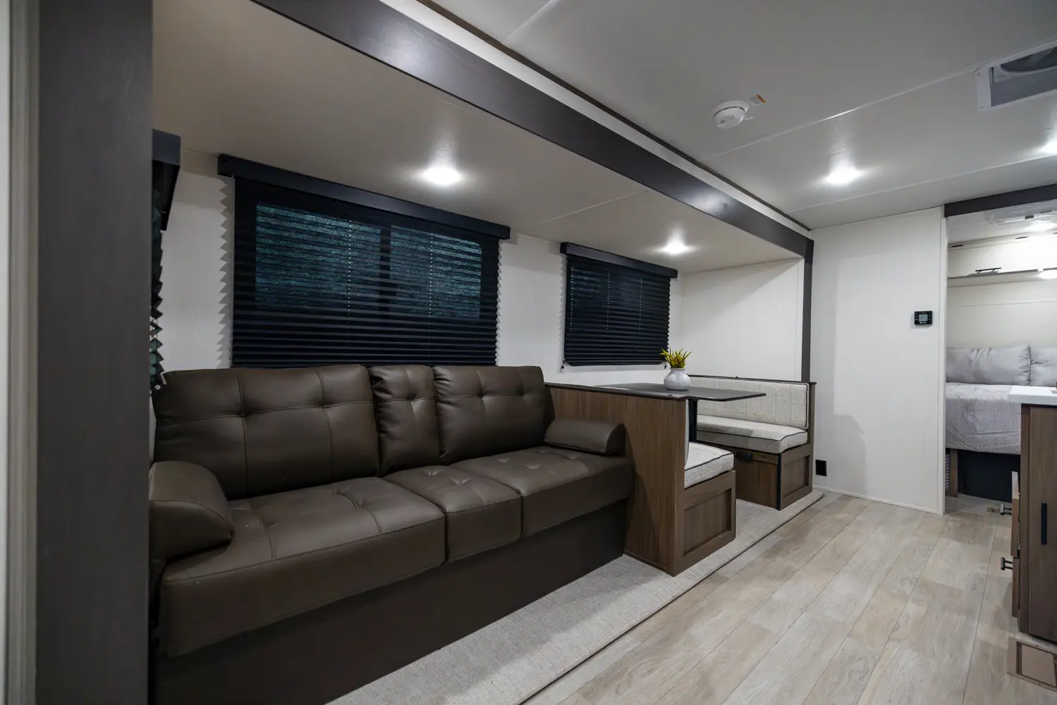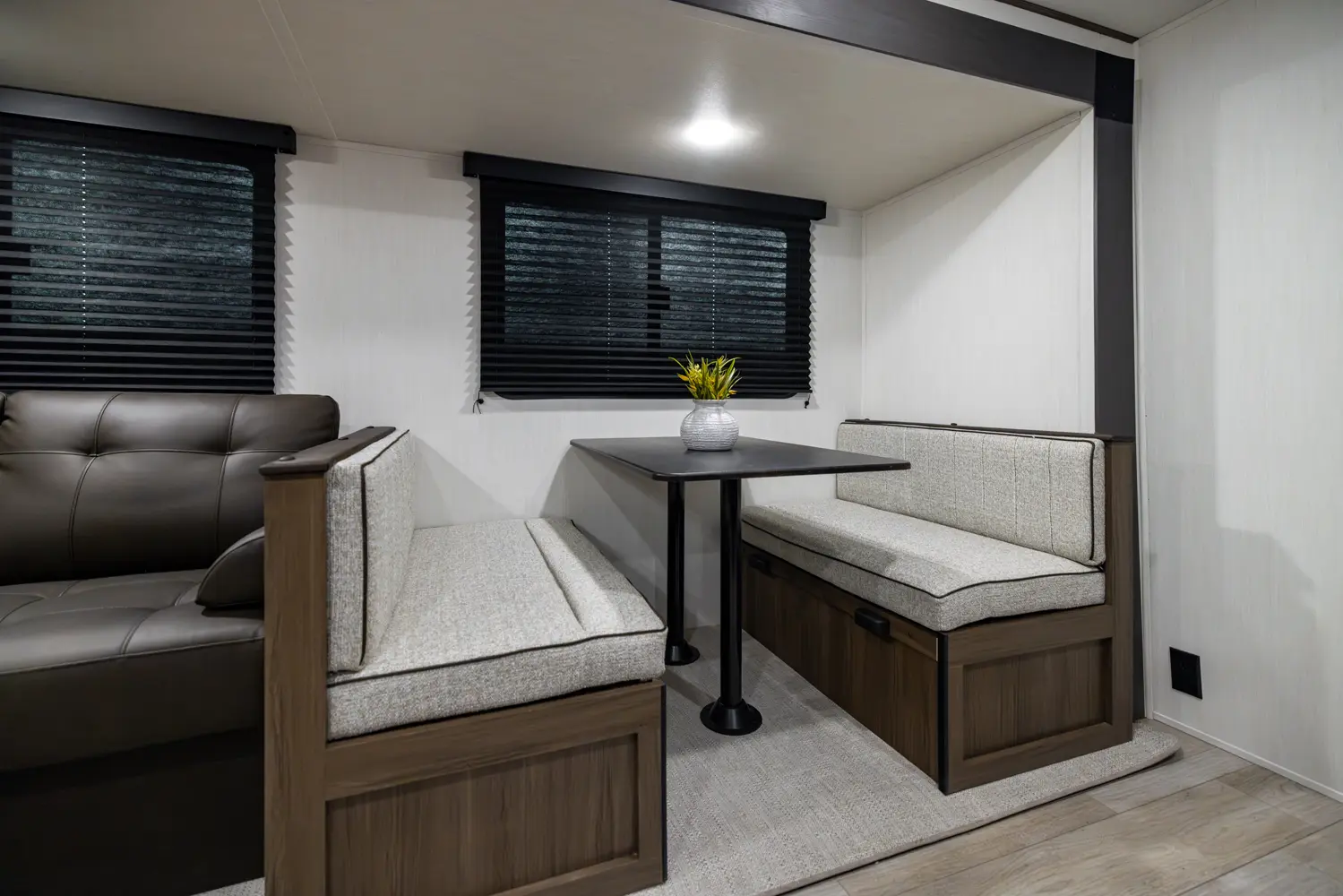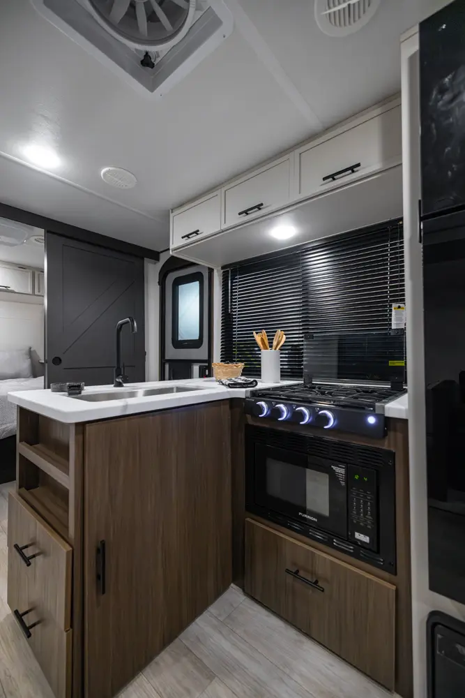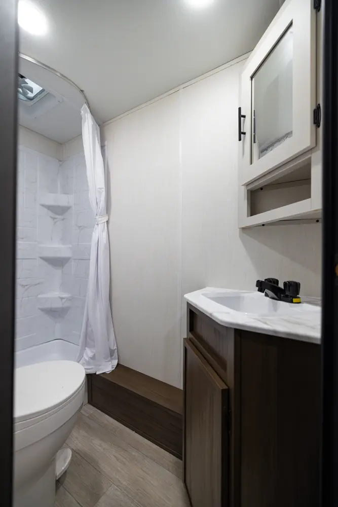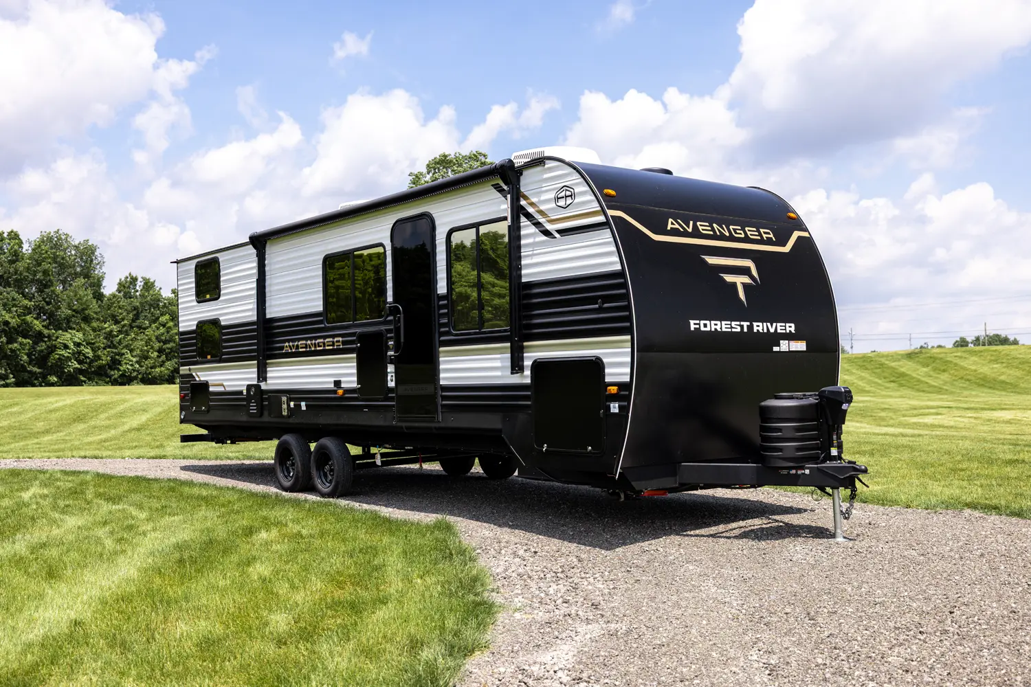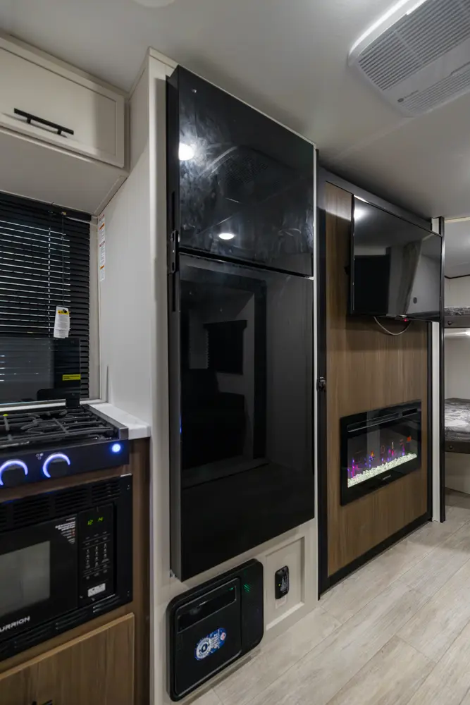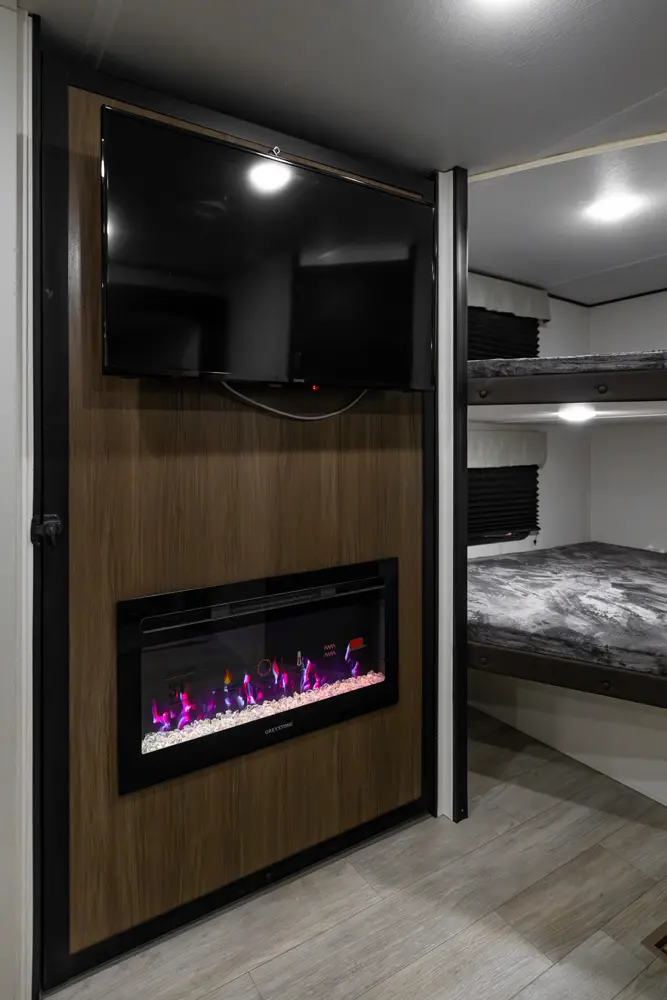 The Avenger 26DBS is a classic family bunk house floorplan that comes equipped with sleeping space provided by a camp king bed in the private master bedroom, two double-over-double bunk beds, as well as our jack knife sofa with a storage ottoman and booth dinette. Well thought-out features include the easy view TV and fireplace, a generous hidden kitchen pantry and standard exterior fridge. Additional storage spaces include the under-bunk cubby and best in class drop frame pass-thru storage.