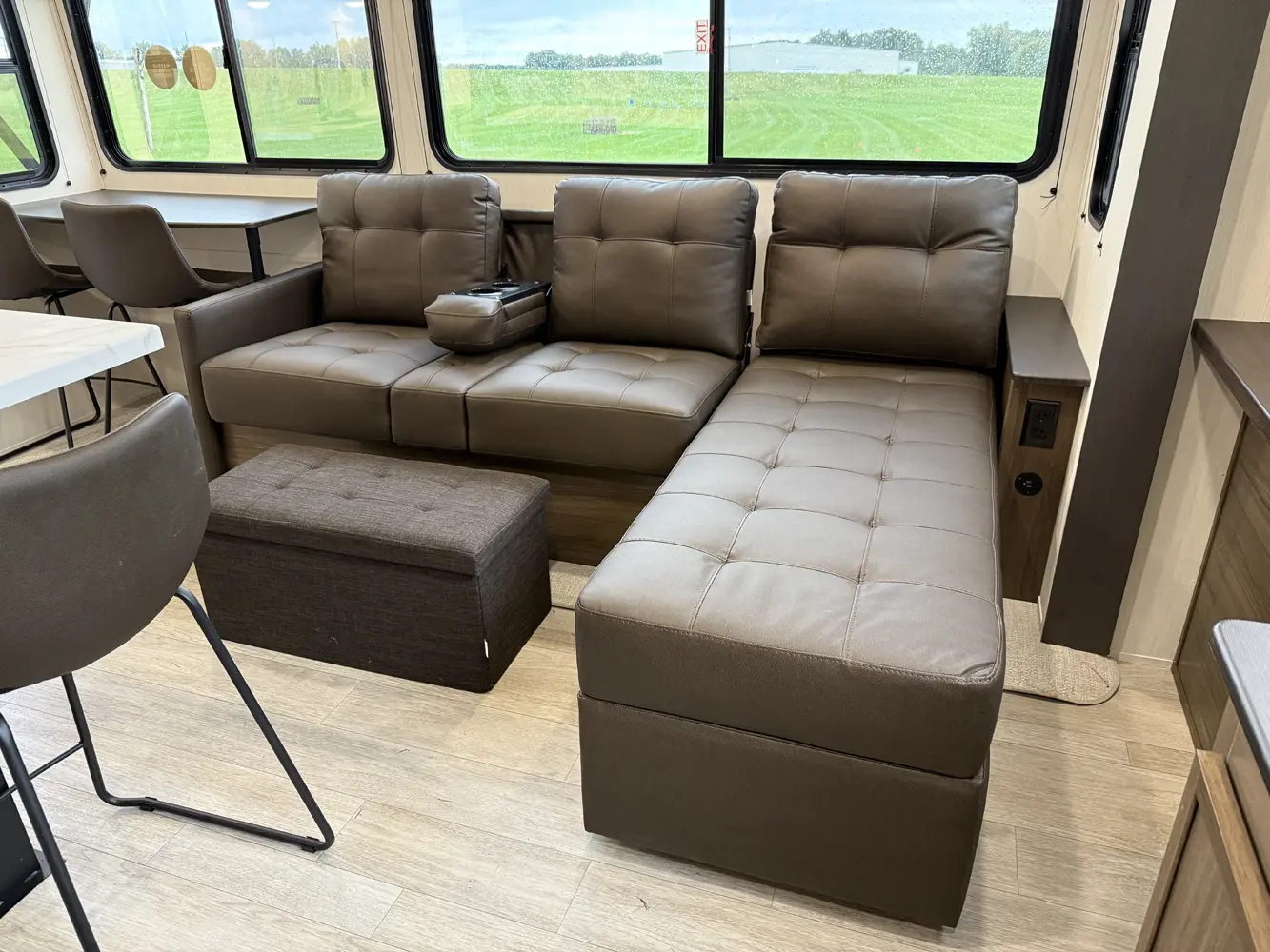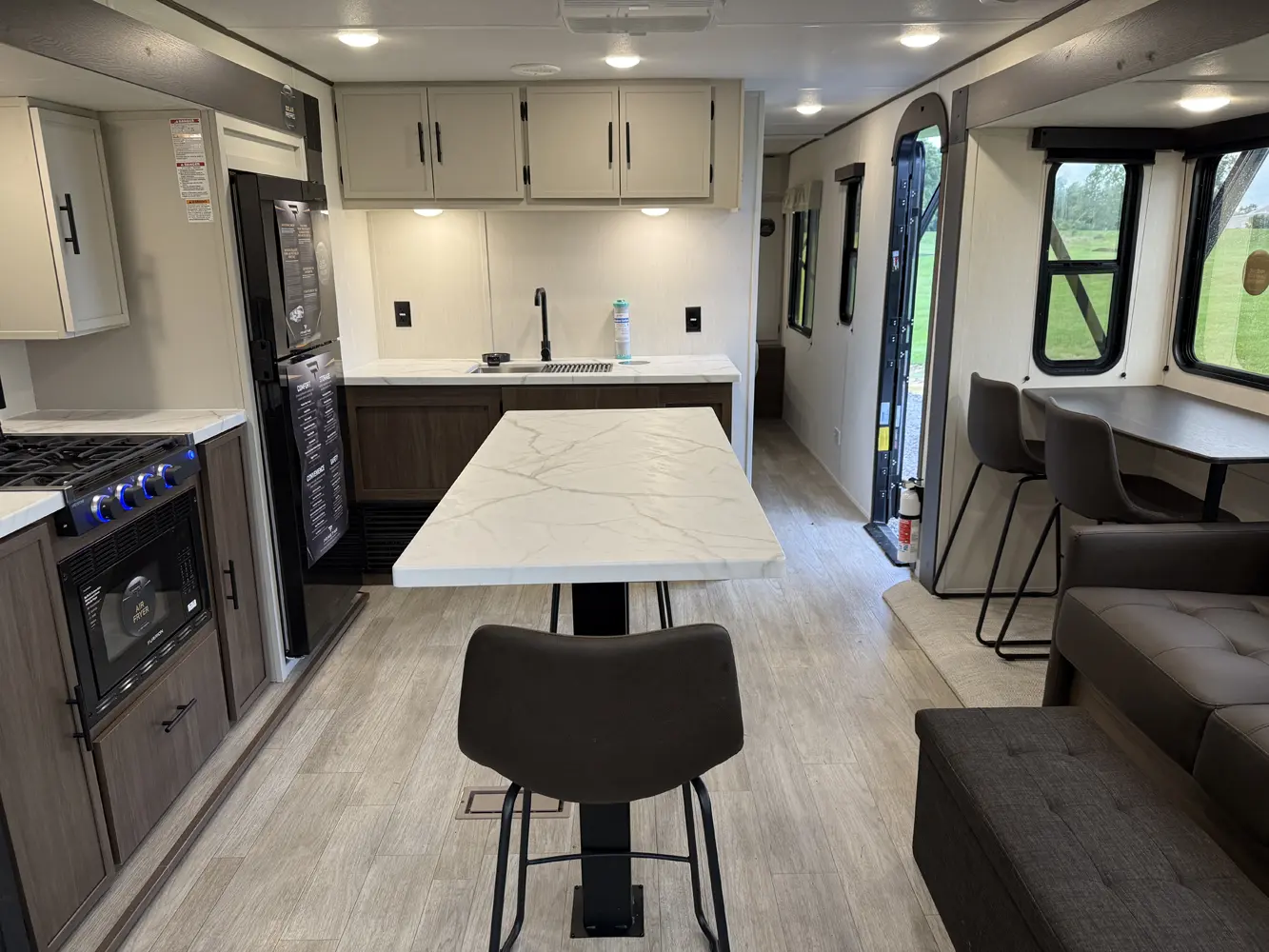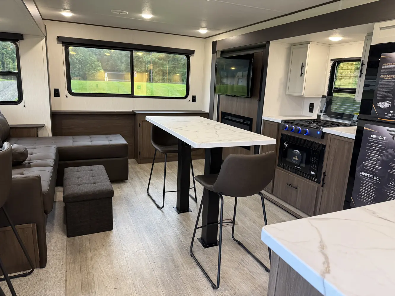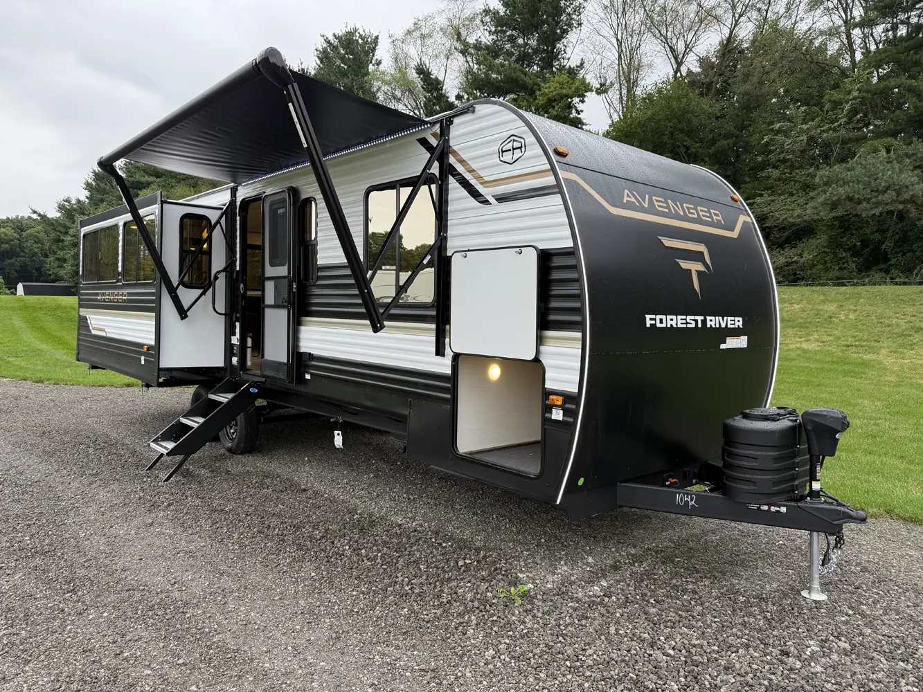 Feel right at home in the Avenger 27REI. Dual opposing slides open up a rear living area with an L-shaped sleeper sofa, farm table, and desk—all framed by a massive panoramic window. The private front bedroom features a camp king bed and closet with washer/dryer prep. Built For You to enjoy the view.