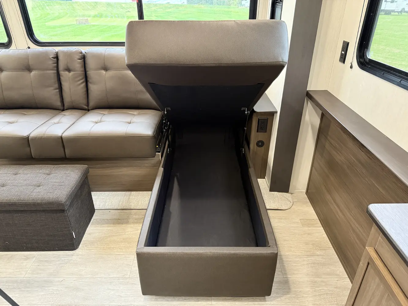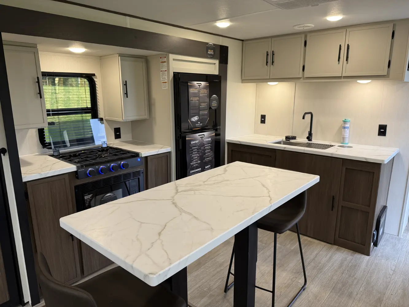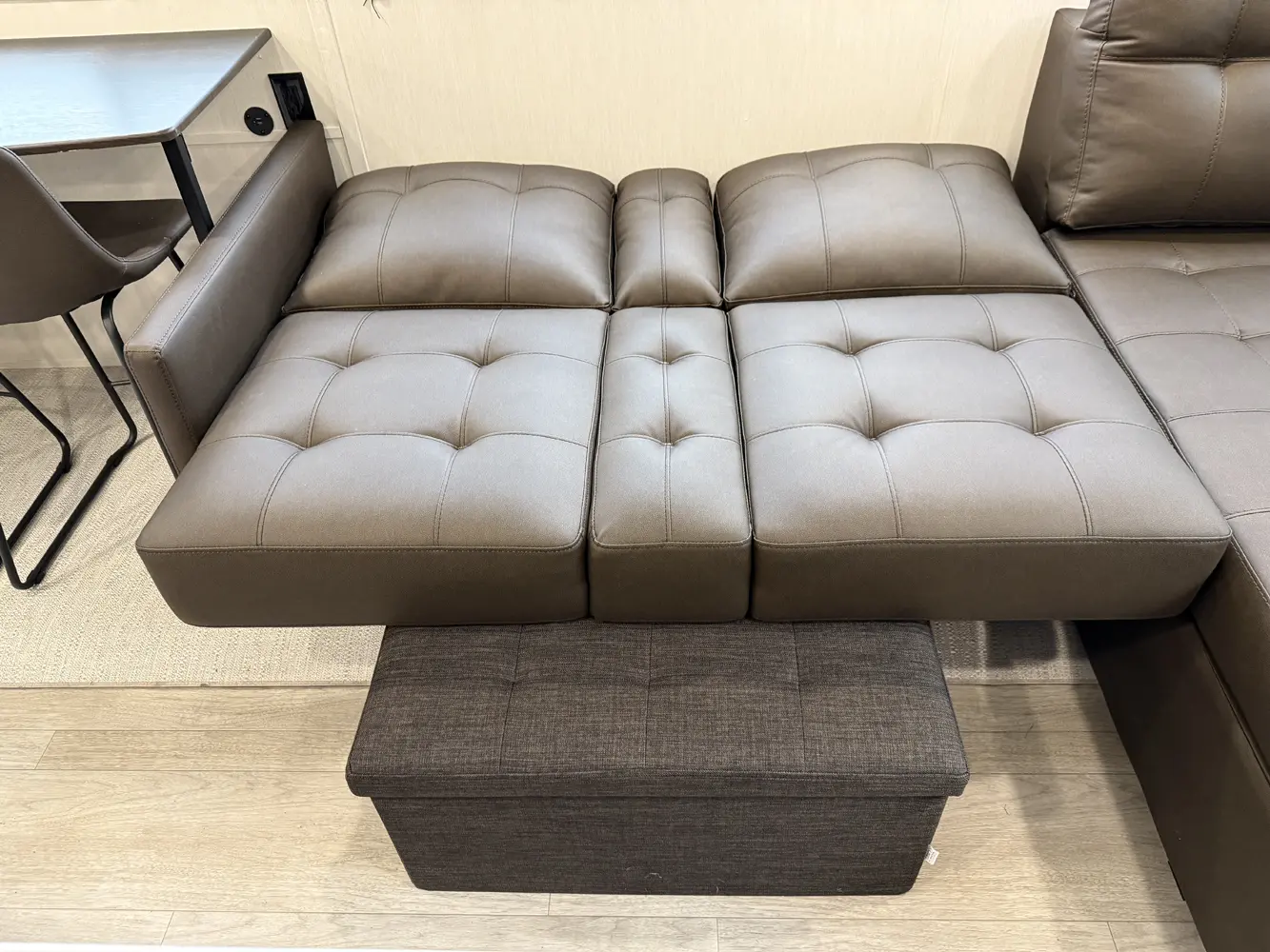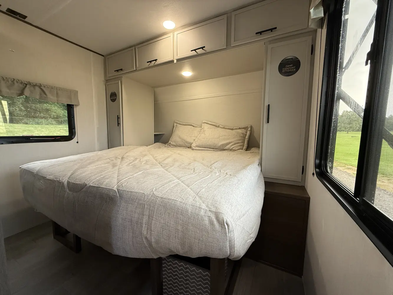 Feel right at home in the Avenger 27REI. Dual opposing slides open up a rear living area with an L-shaped sleeper sofa, farm table, and desk—all framed by a massive panoramic window. The private front bedroom features a camp king bed and closet with washer/dryer prep. Built For You to enjoy the view.