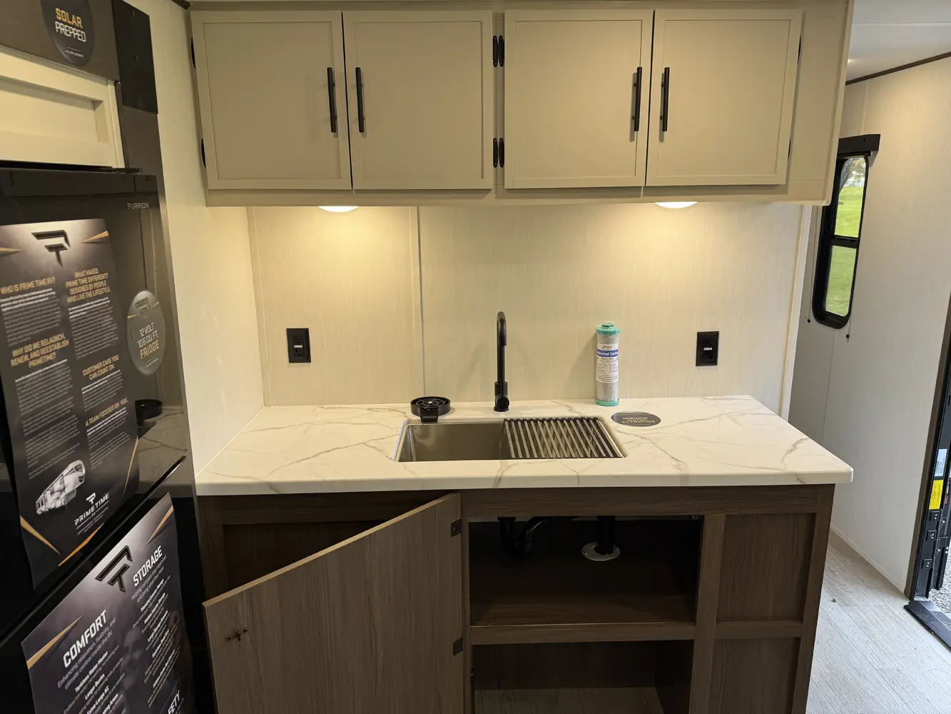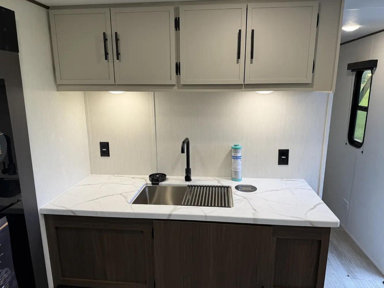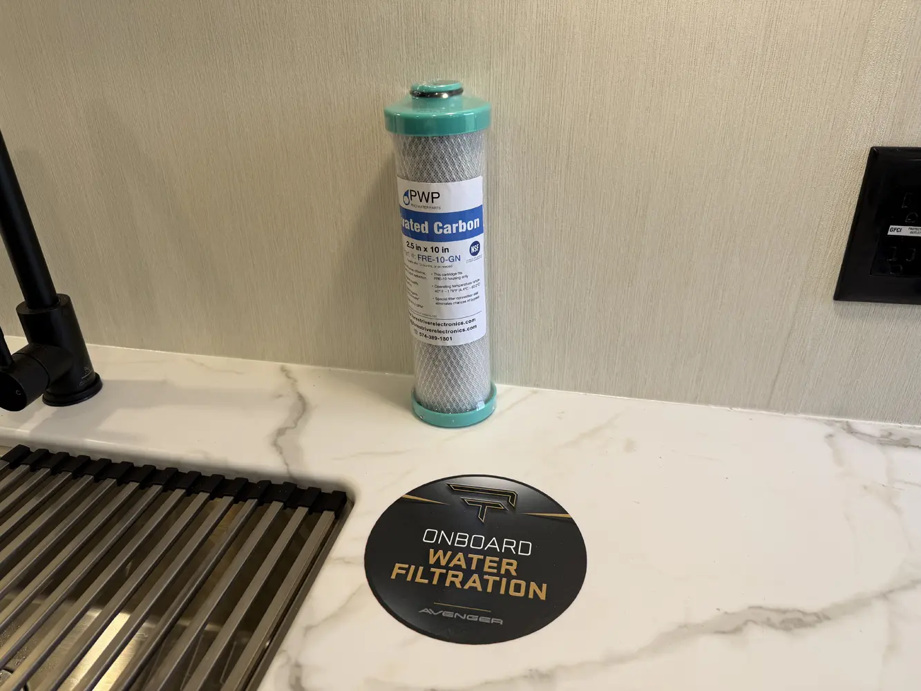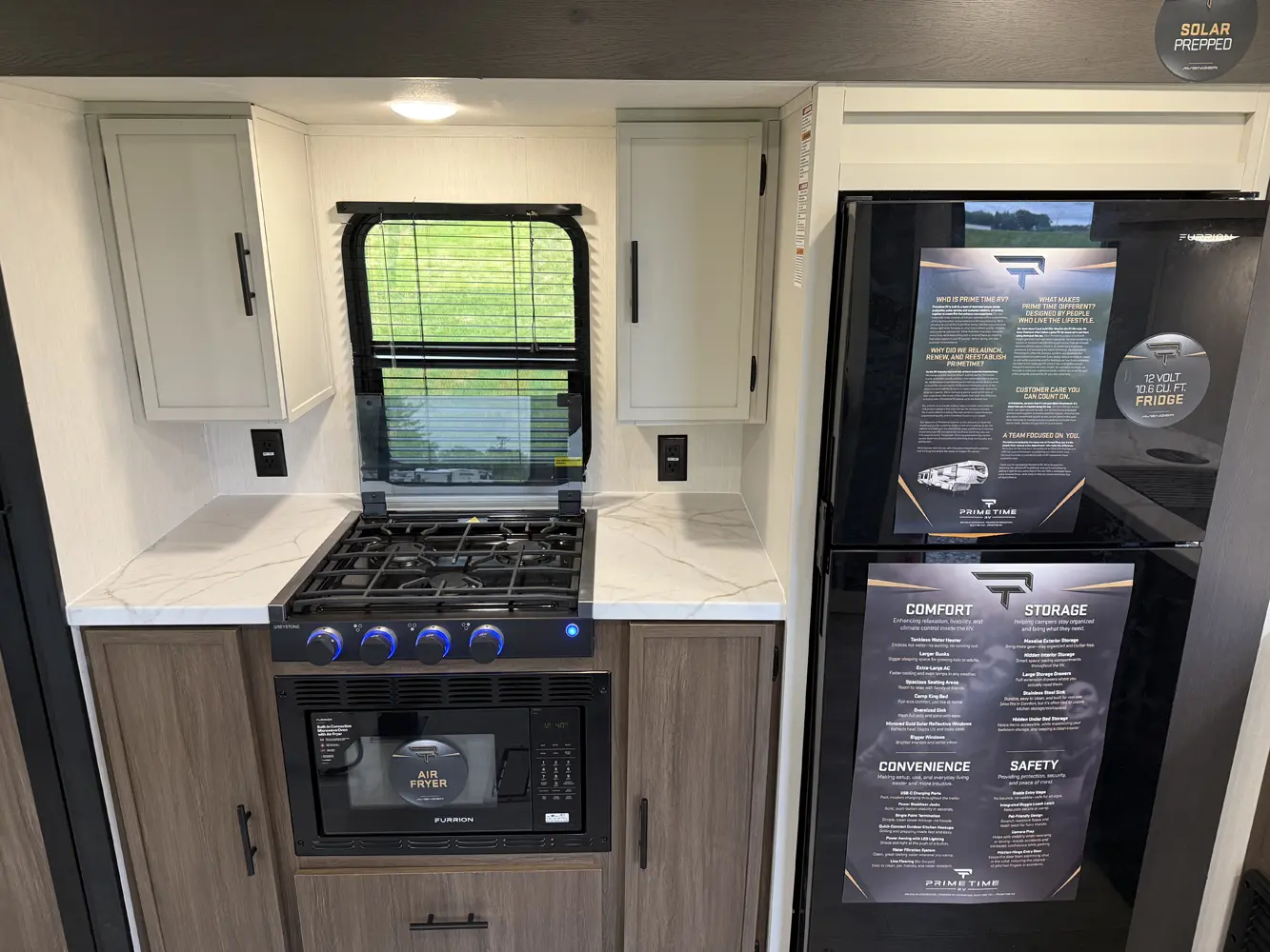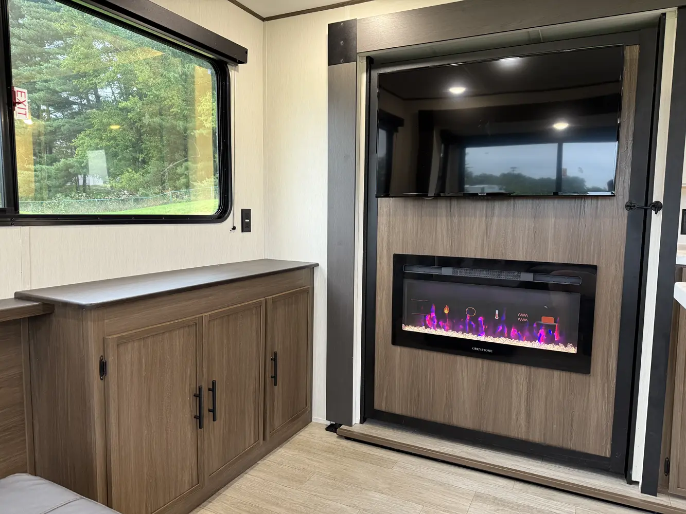 Feel right at home in the Avenger 27REI. Dual opposing slides open up a rear living area with an L-shaped sleeper sofa, farm table, and desk—all framed by a massive panoramic window. The private front bedroom features a camp king bed and closet with washer/dryer prep. Built For You to enjoy the view.