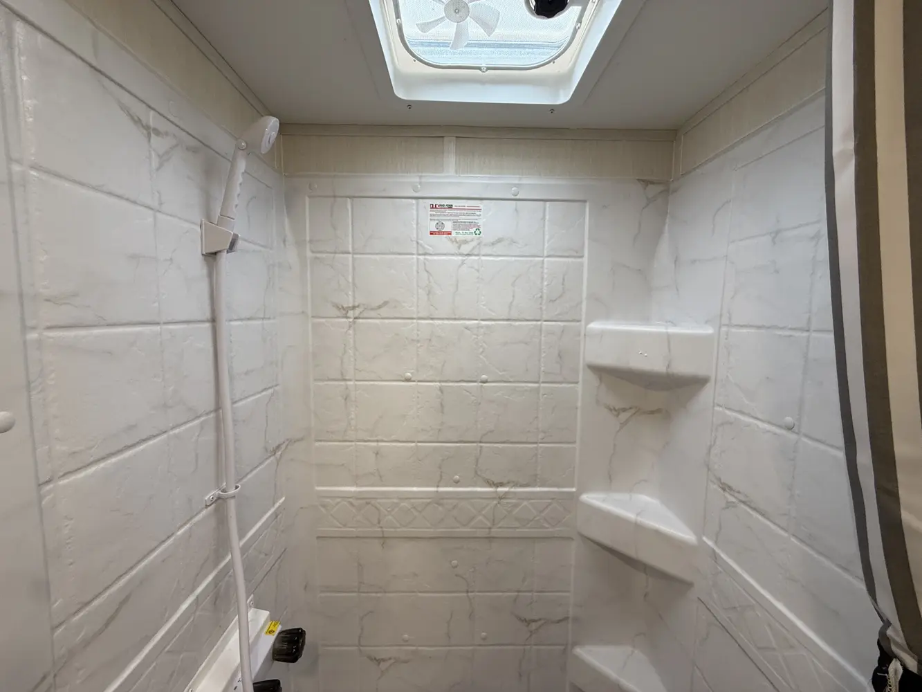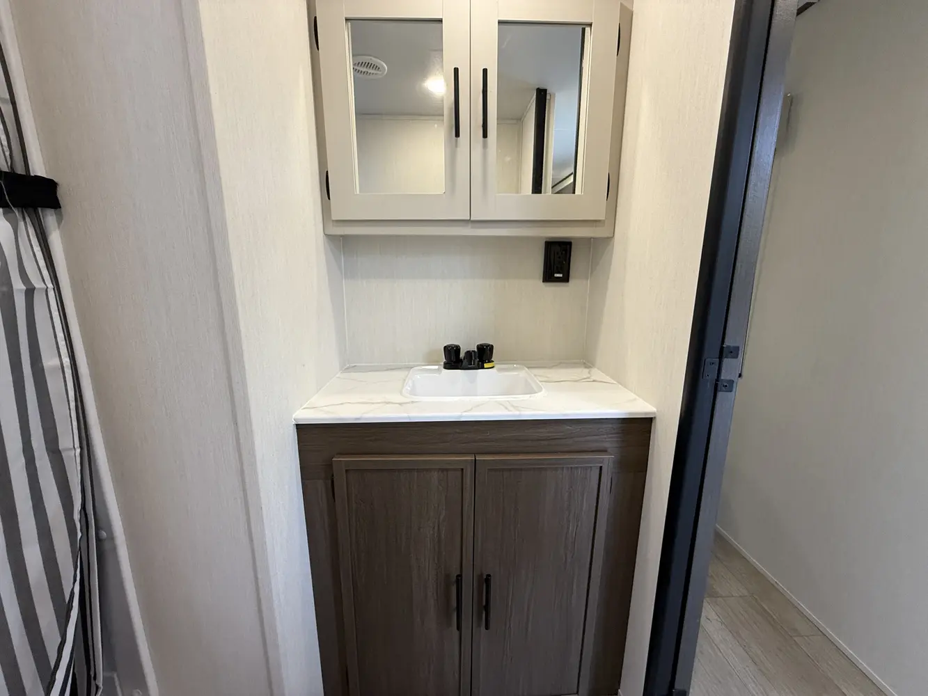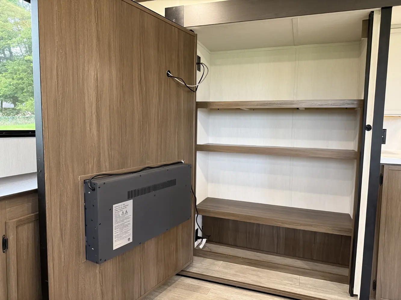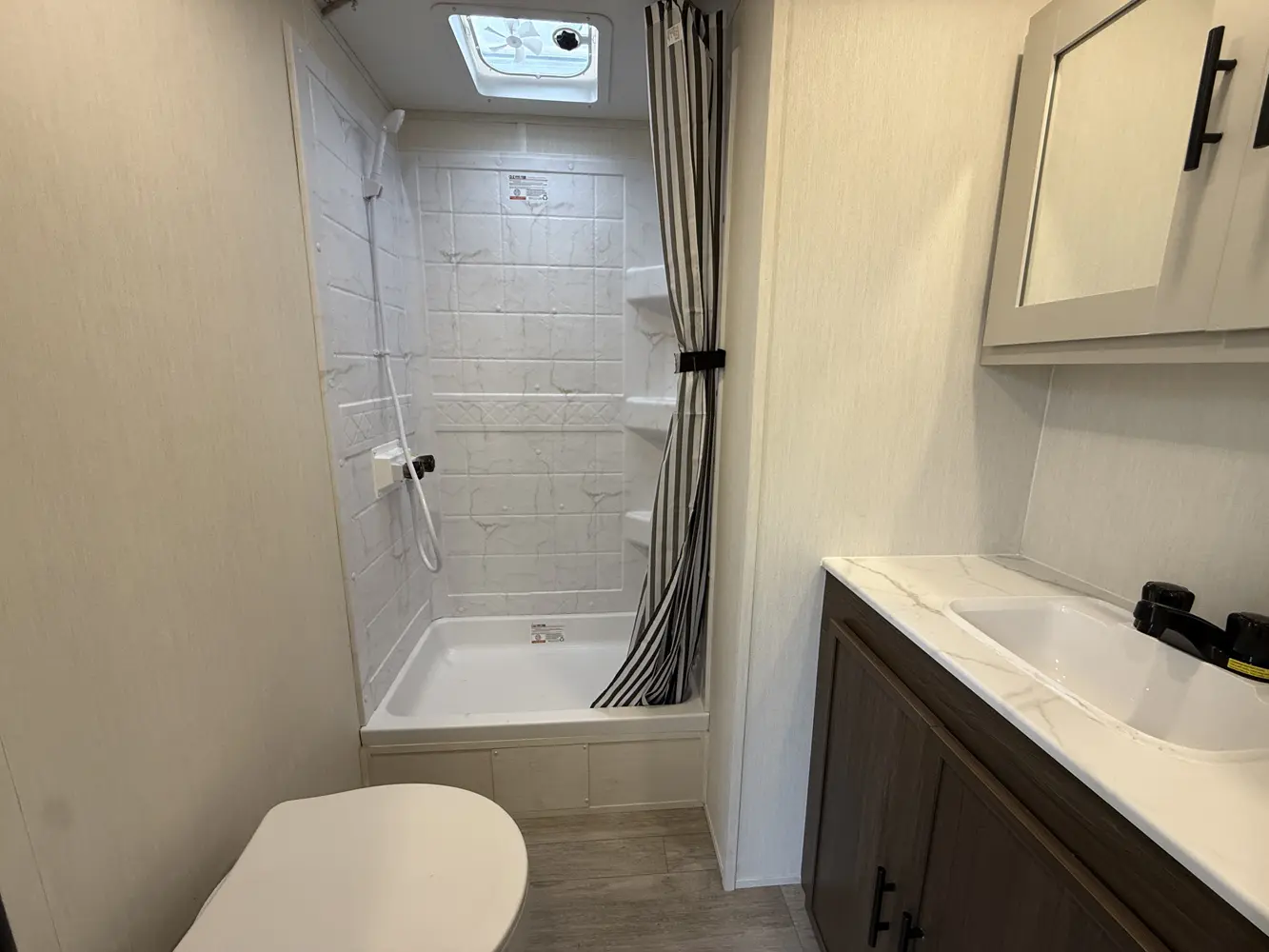 Feel right at home in the Avenger 27REI. Dual opposing slides open up a rear living area with an L-shaped sleeper sofa, farm table, and desk—all framed by a massive panoramic window. The private front bedroom features a camp king bed and closet with washer/dryer prep. Built For You to enjoy the view.