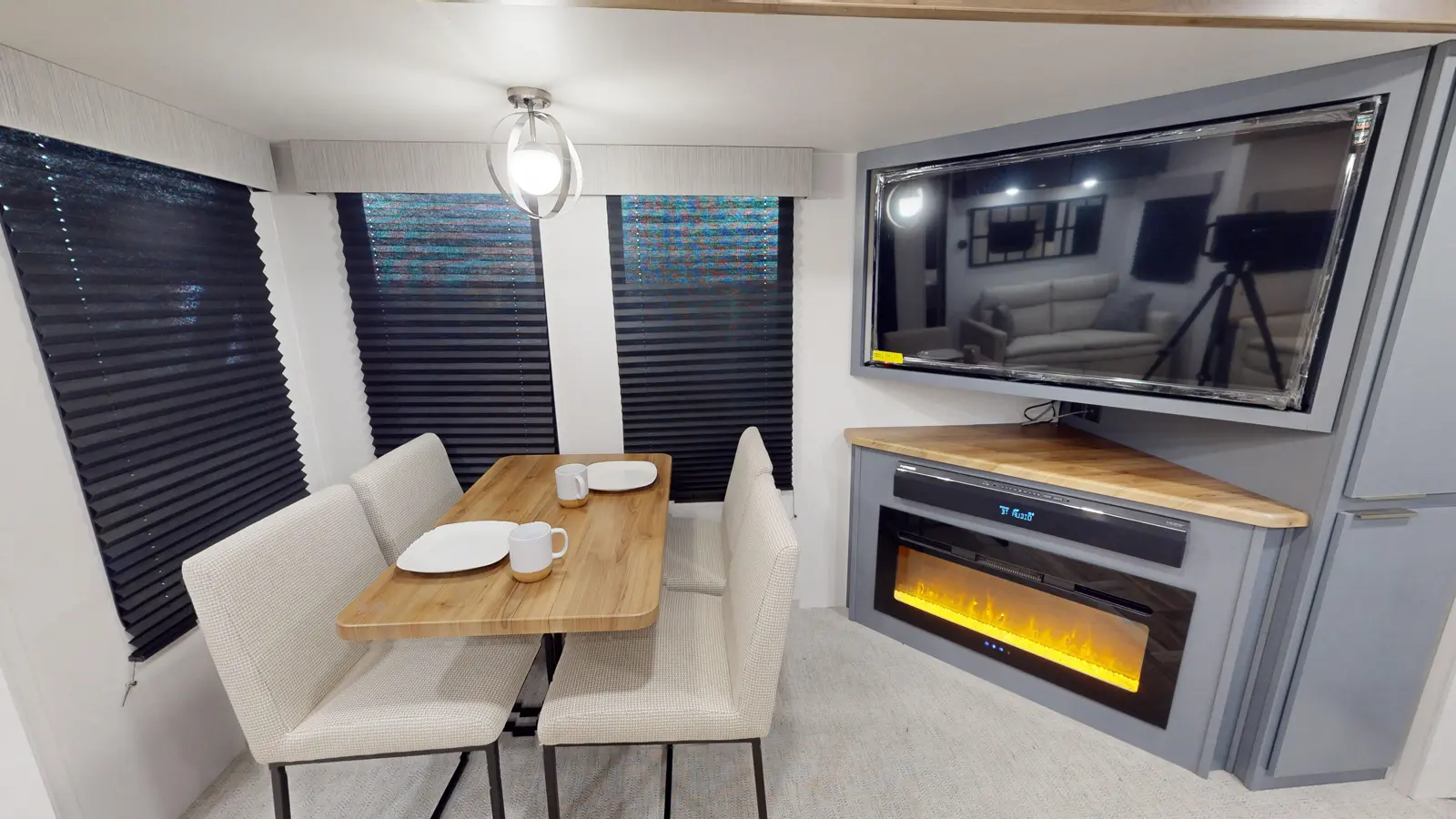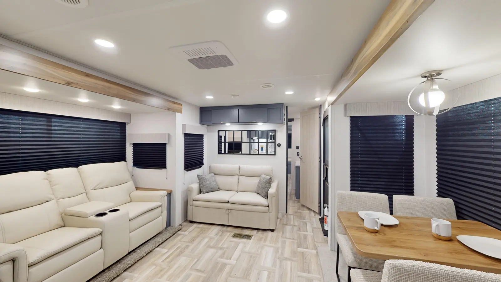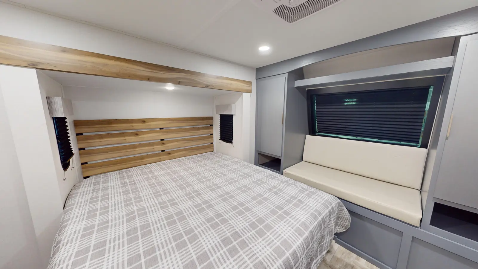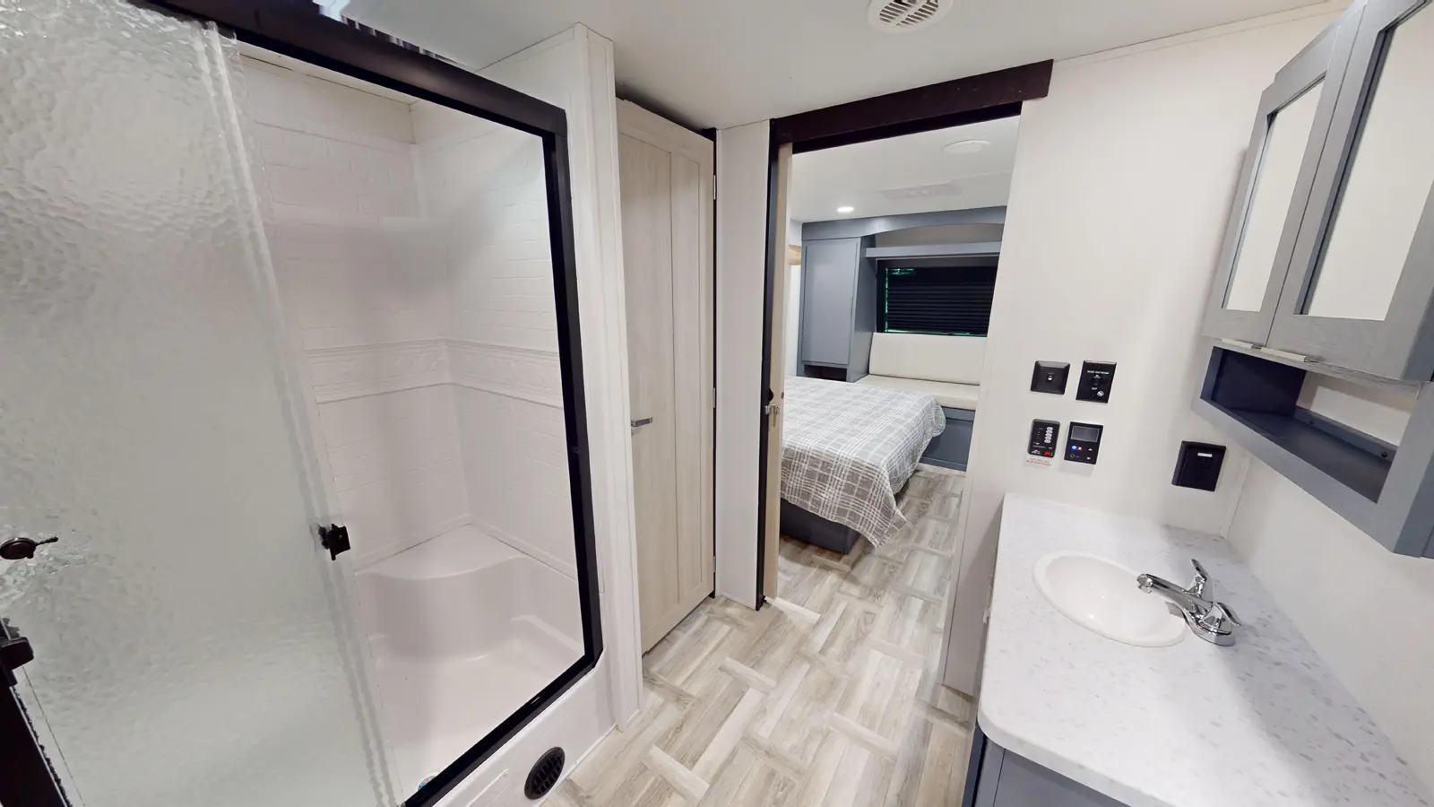 The Lacrosse 3411RK is a favorite in our lineup, with several unique touches you won't find anywhere else. First, in the front master bedroom, there's a 70" x 80" walkaround king bed with slideout, wardrobe closets, a reading bench, and a dresser/fireplace combo. The bathroom is generously sized, with a residential shower with molded seat and glass doors, porcelain toilet, vanity sink with countertop, and double medicine cabinet for all the essentials.