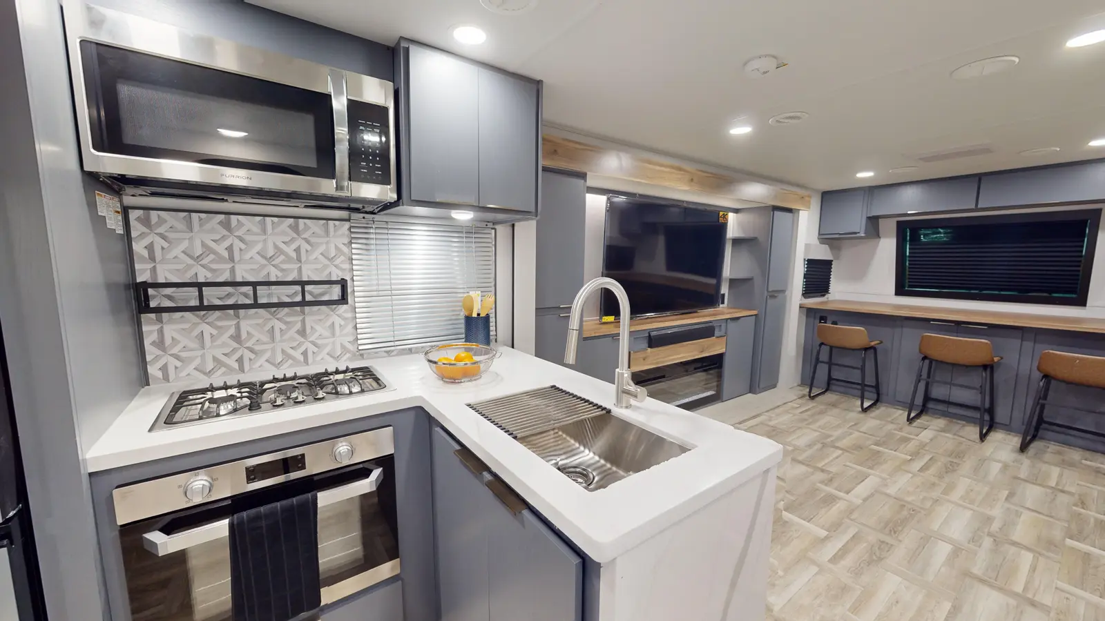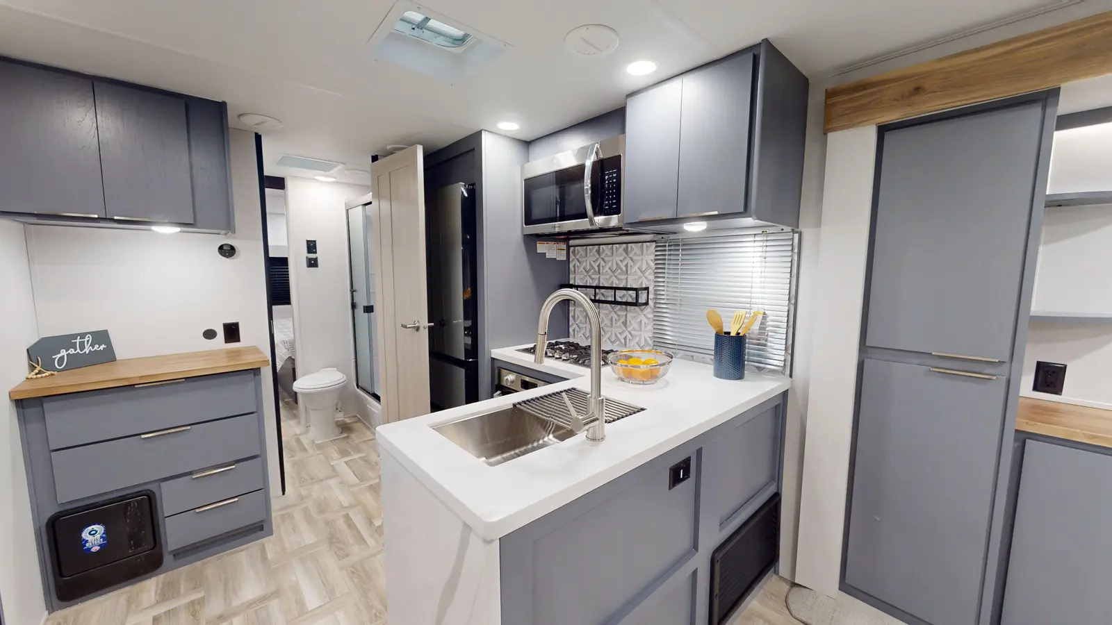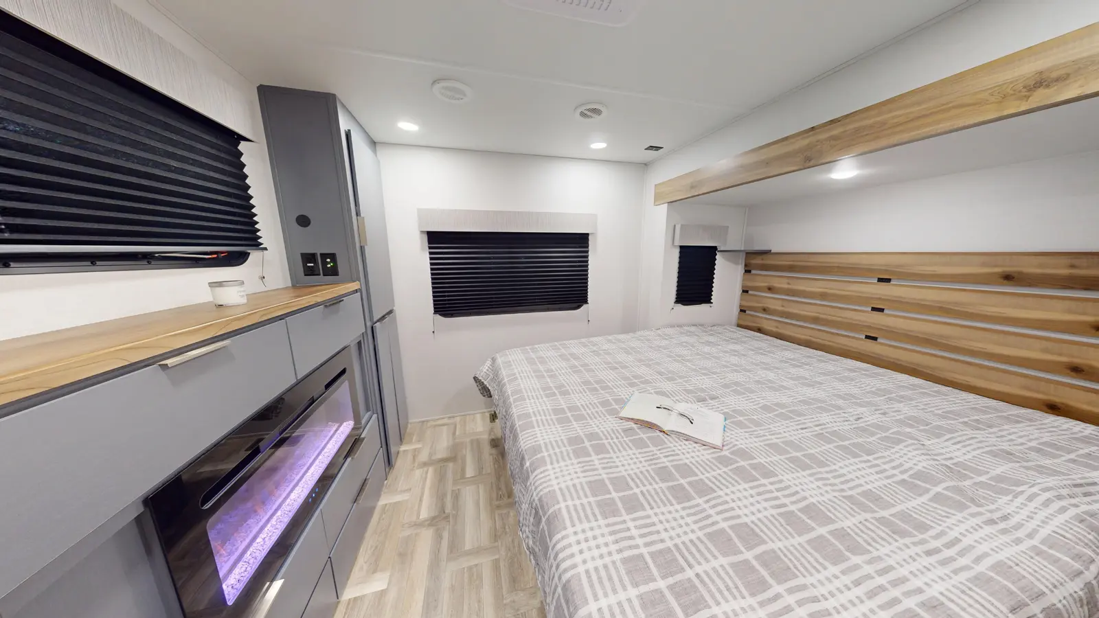 The LaCrosse 3450FB floorplan has one entry and three slide outs. Exterior features include: fiberglass exterior and 19' & 9'6" awning. Interiors features include: rear bedroom, front living and pass through bathroom.