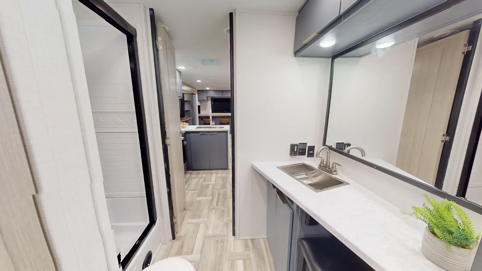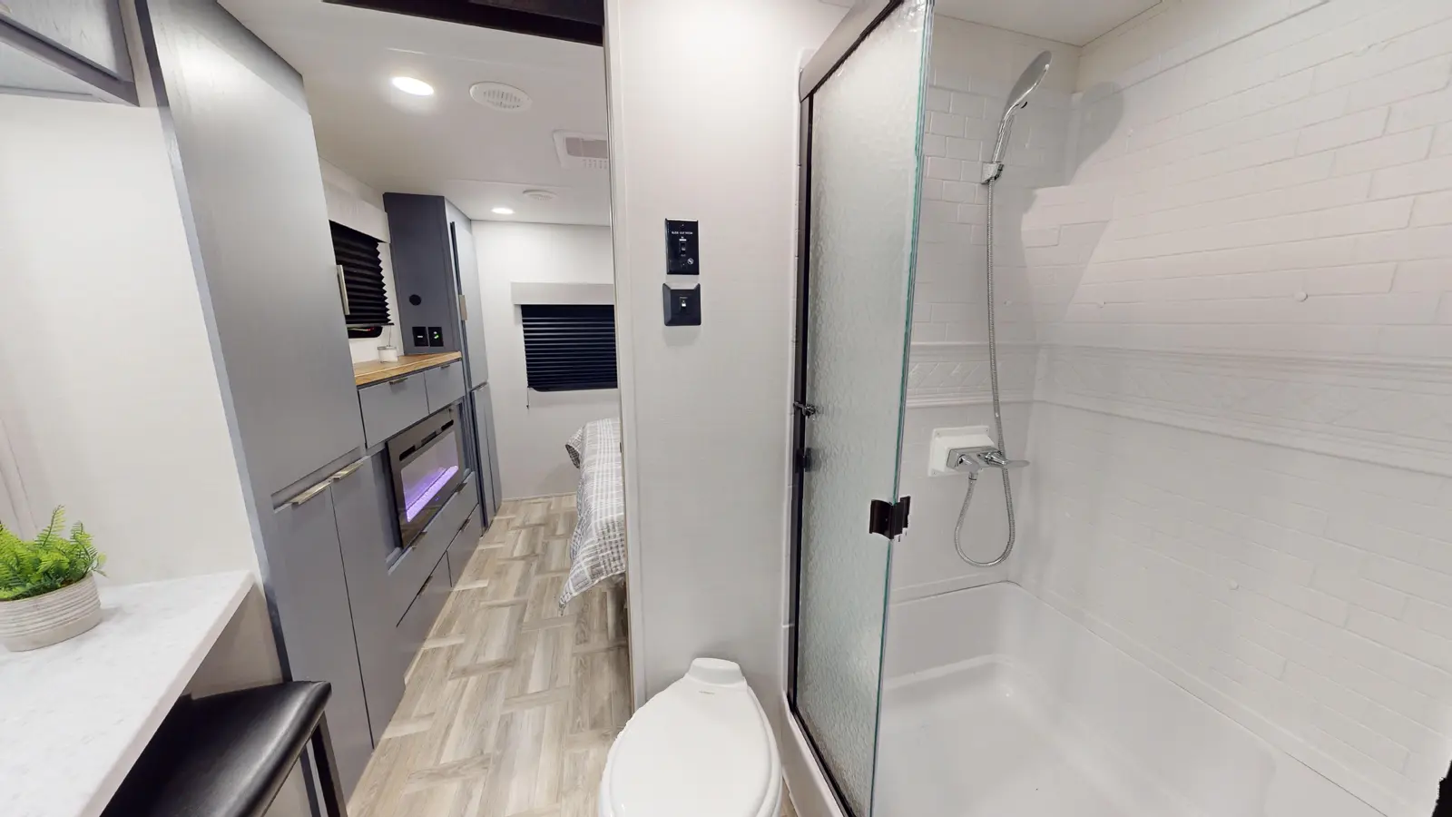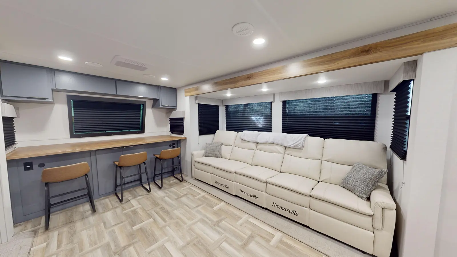 The LaCrosse 3450FB floorplan has one entry and three slide outs. Exterior features include: fiberglass exterior and 19' & 9'6" awning. Interiors features include: rear bedroom, front living and pass through bathroom.
