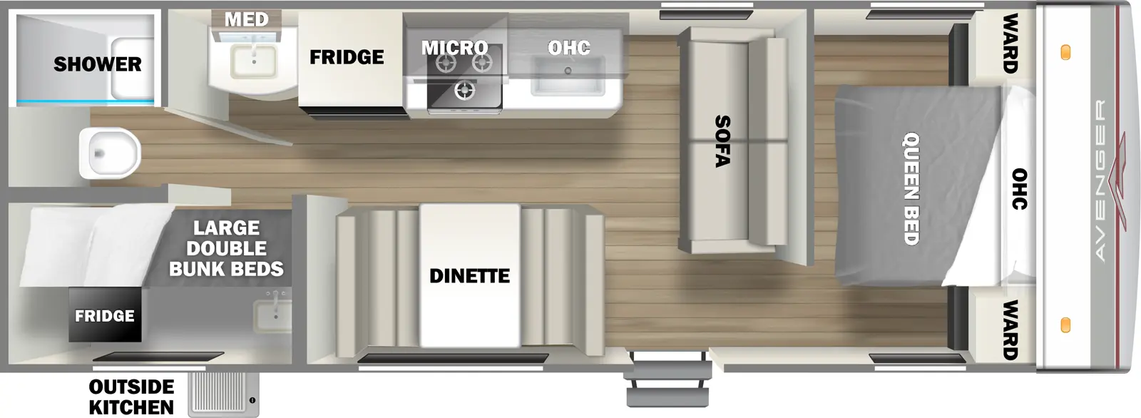Looking for a comfortable family travel trailer? The Avenger 26BK by Forest River makes the most of its 28ft 11in overall length with a smartly designed interior! Enjoy a private front queen bedroom with ample wardrobe space. The cozy living area features a stylish faux rock accent wall and matching backsplash. Chef's will love the well-equipped kitchen that boasts a stovetop/oven, farmhouse sink, and microwave. Plus, kids will love the rear bunk room with double bunks.