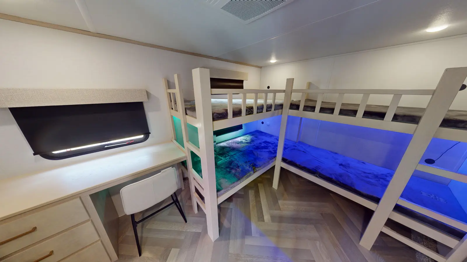 The Sanibel 3952FBWB has one entry and four slide outs. Exterior features include: fiberglass exterior and 12' & 18' awning. Interiors features include: bunk beds, kitchen island and rear bathroom.