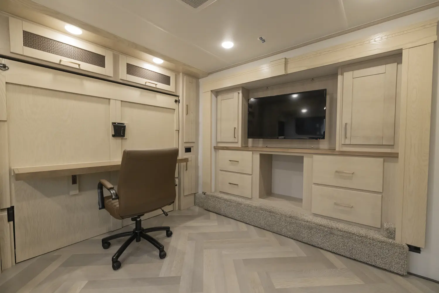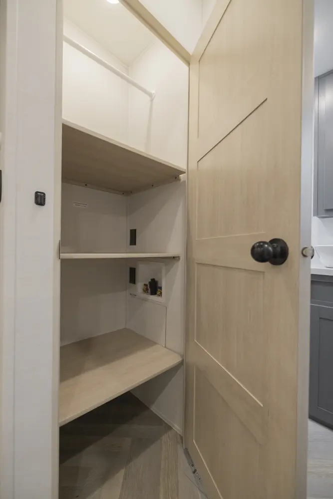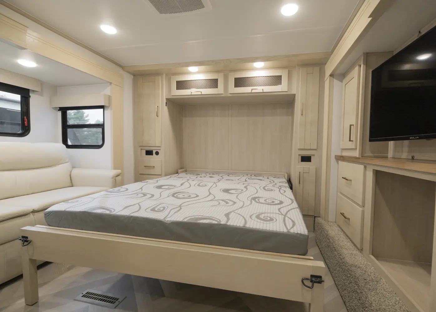 The Sanibel 3982DBWB floorplan has one entry and five slide outs. Exterior features include: fiberglass exterior and 10' & 18' awning. Interiors features include: kitchen island, murphy bed, rear bathroom and two full bathrooms.