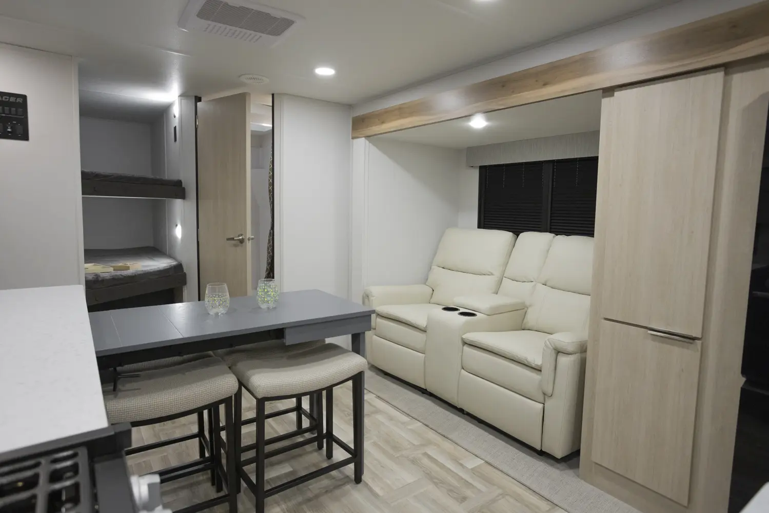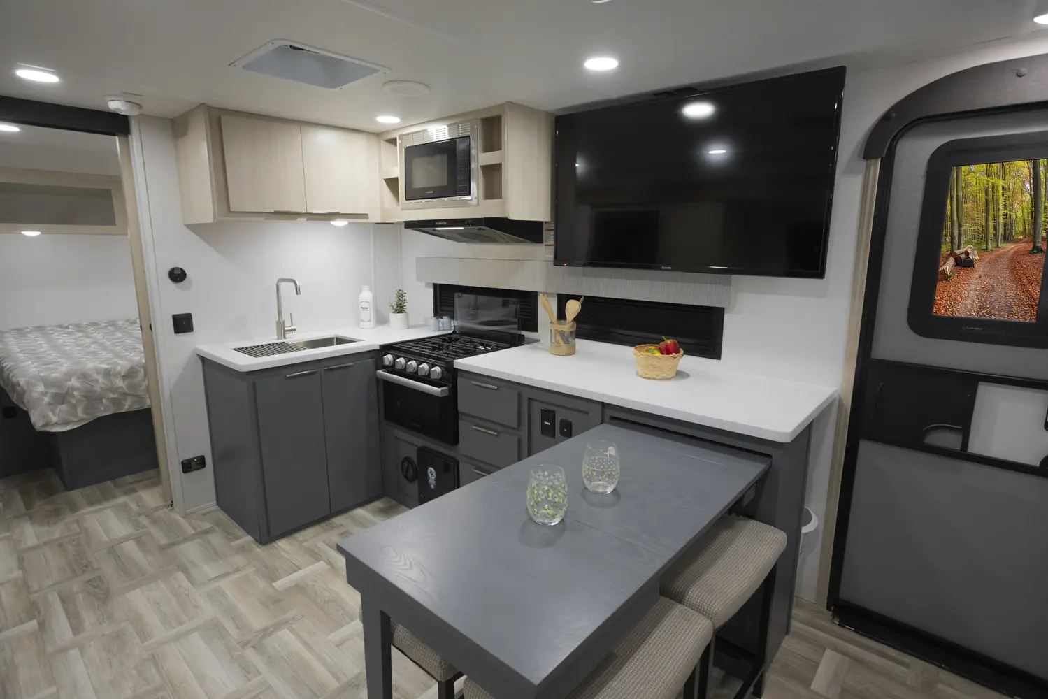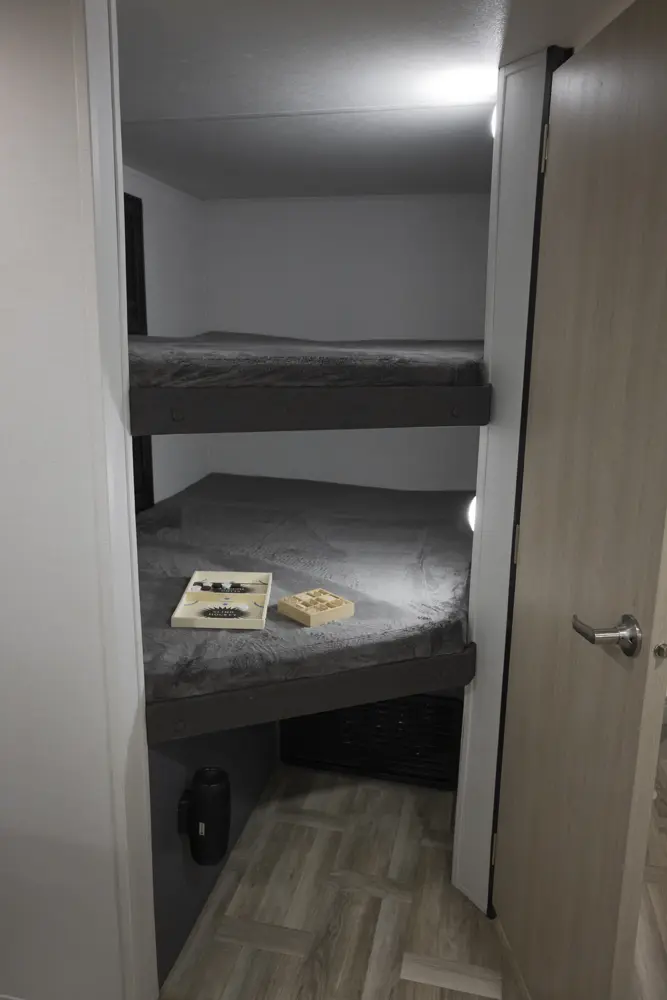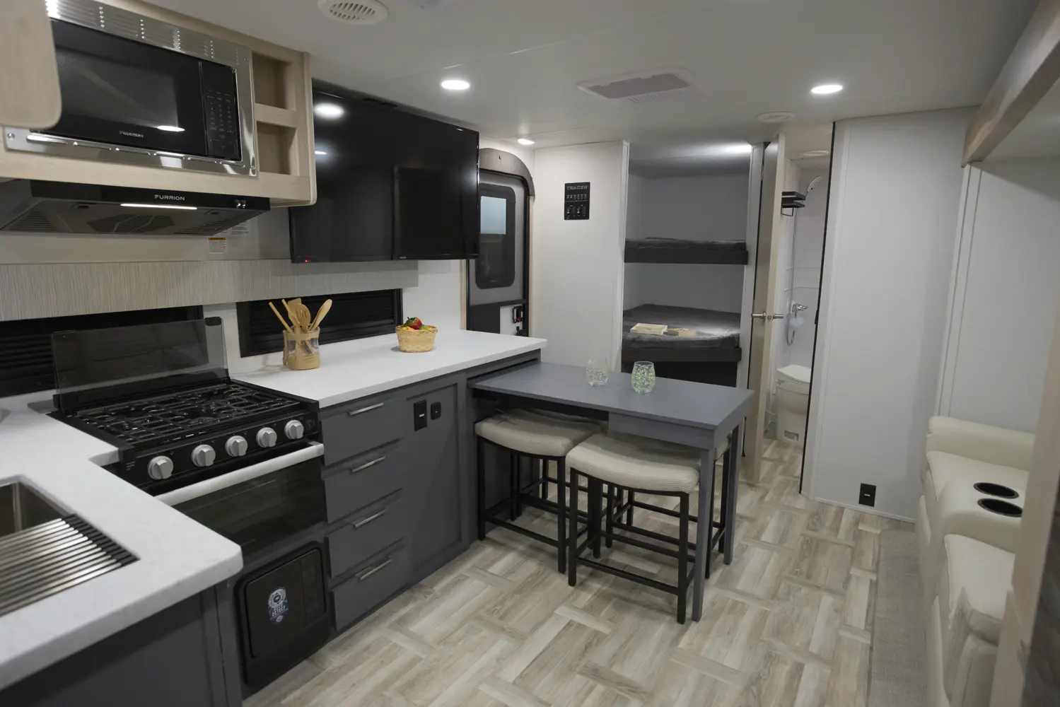 The Tracer 250BH floorplan has one entry and one slide out. Exterior features include: fiberglass exterior and outside kitchen. Interiors features include: bunk beds and front bedroom.