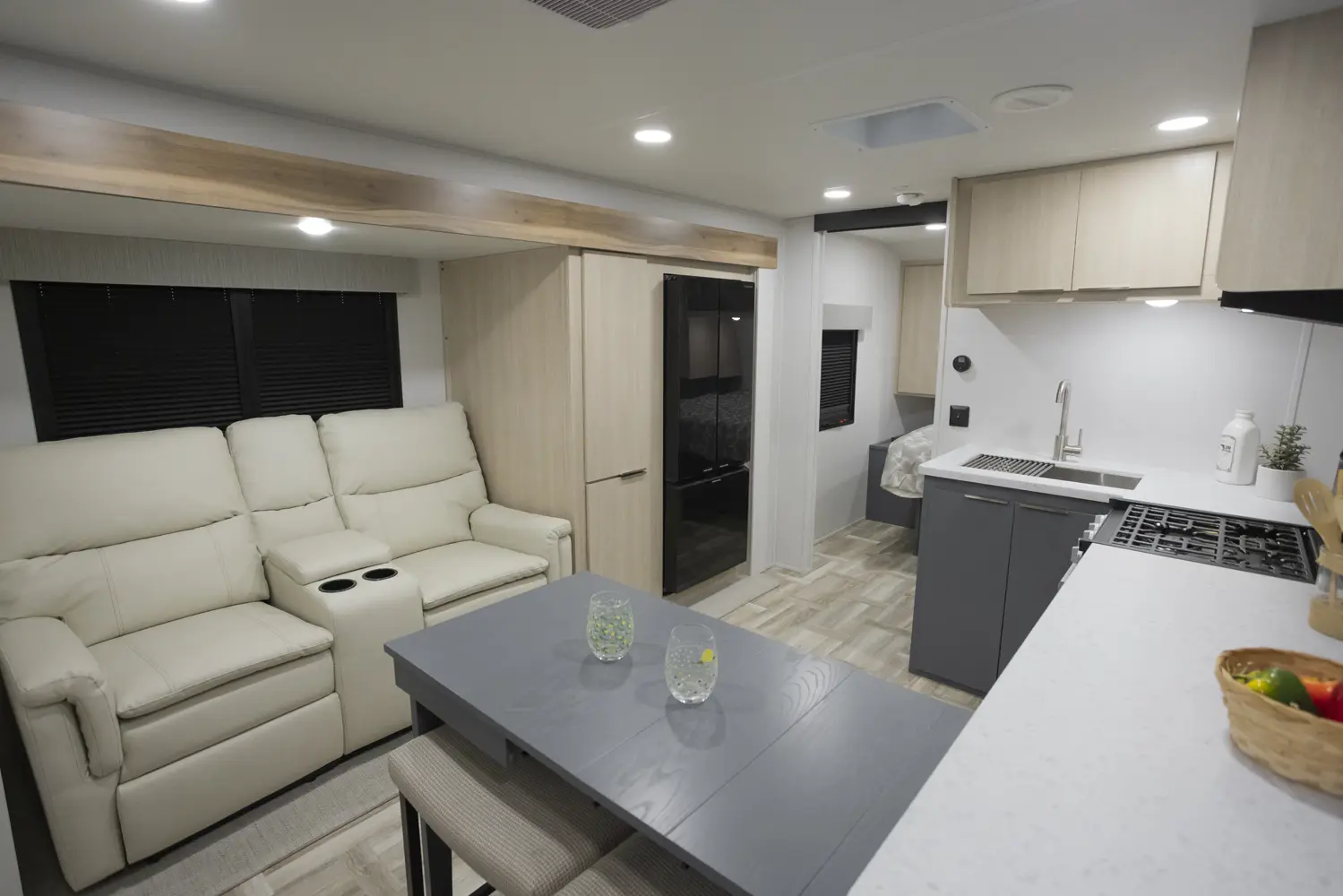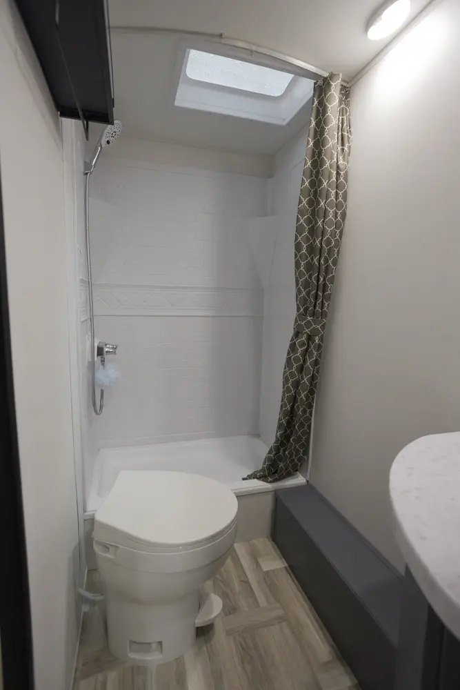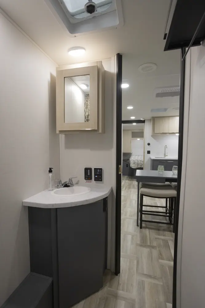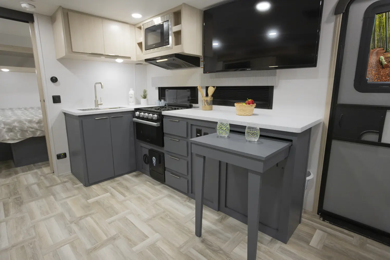The Tracer 250BH floorplan has one entry and one slide out. Exterior features include: fiberglass exterior and outside kitchen. Interiors features include: bunk beds and front bedroom.