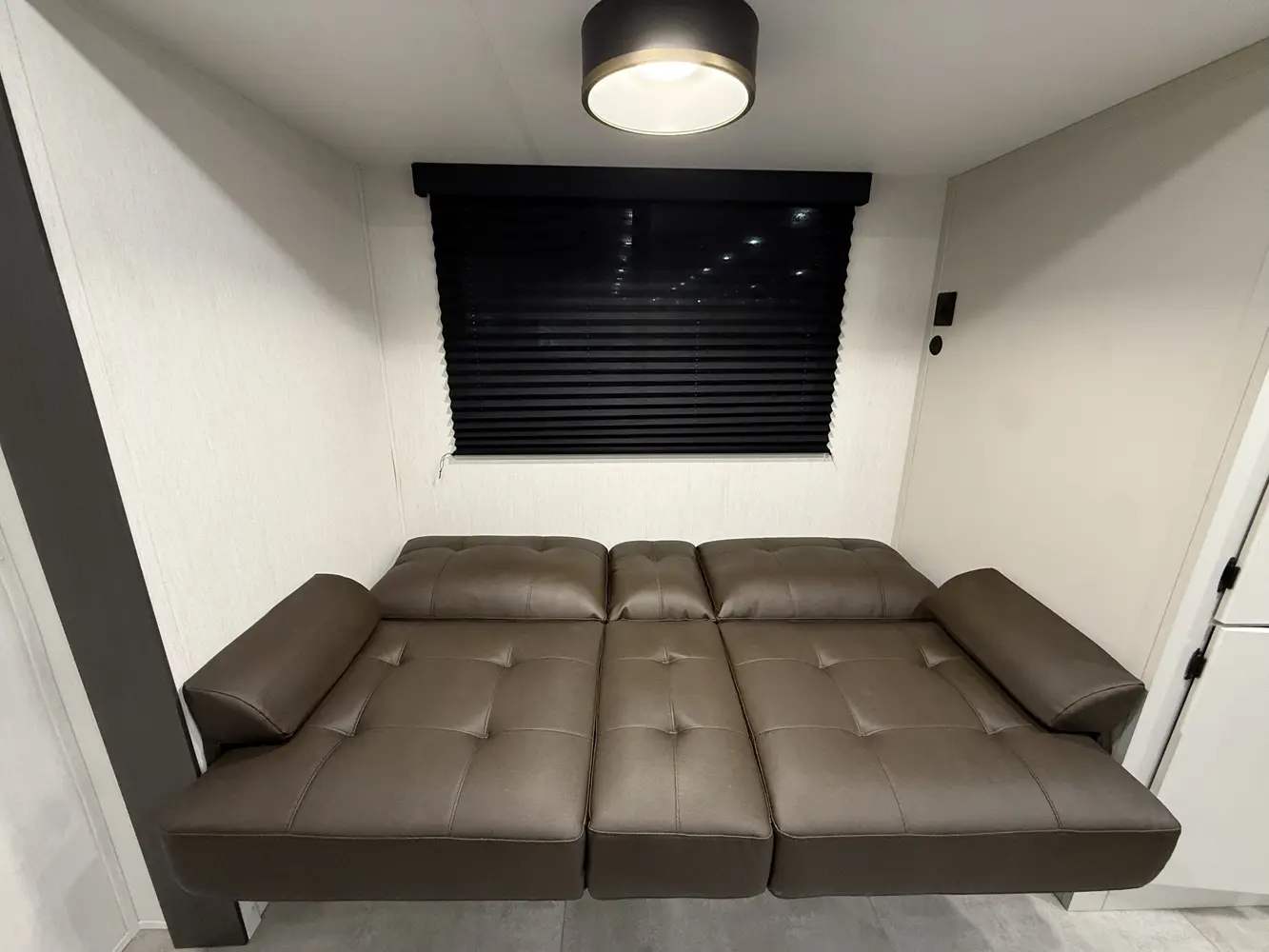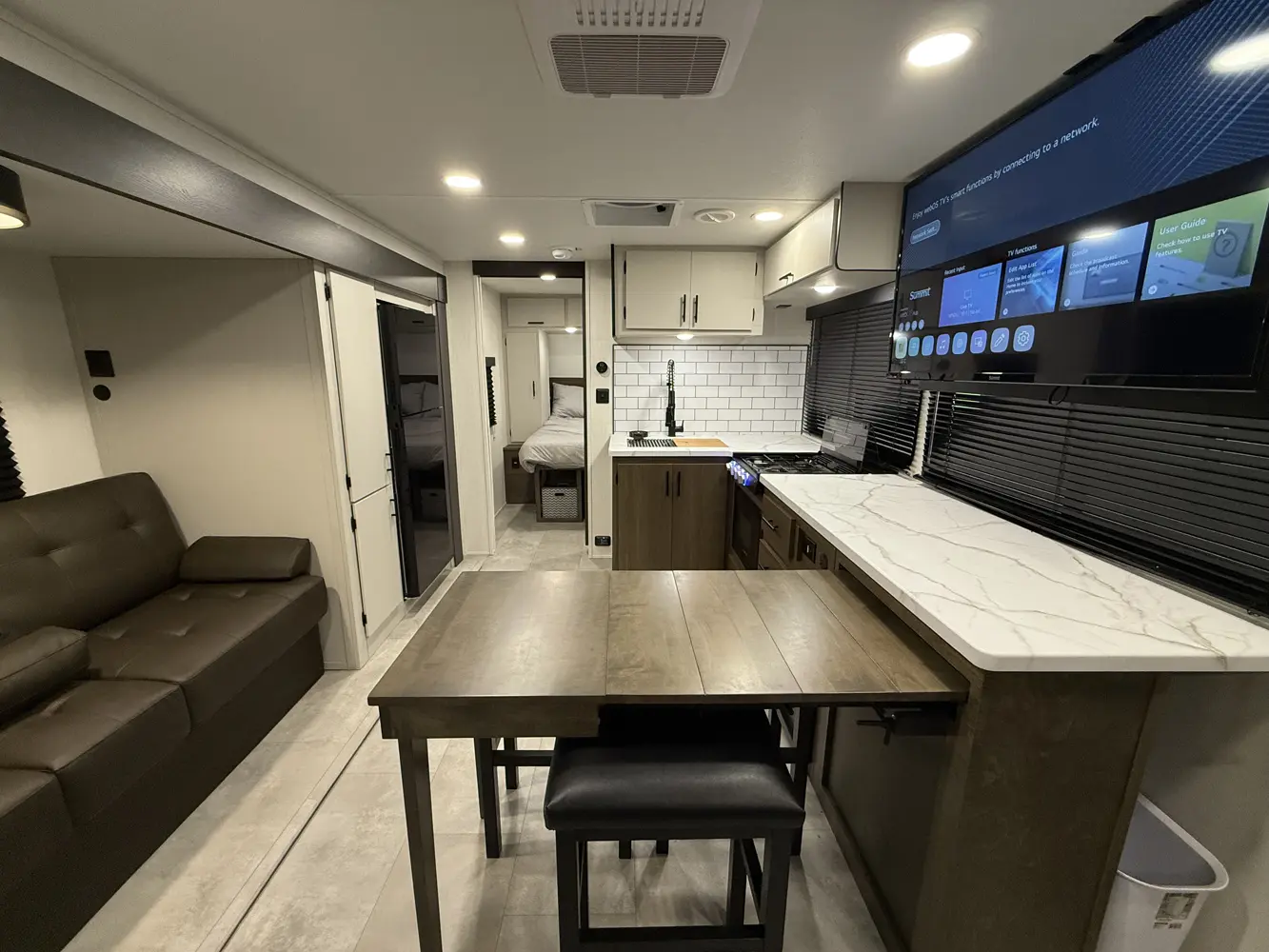 The Tracer 255DS is a unique and compact option for couples and solo campers alike. The modular design of the kitchen dinette allows for it to expand into more countertop space or seating for 4. You also get washer/dryer prep and a desk in a package under 30 ft!