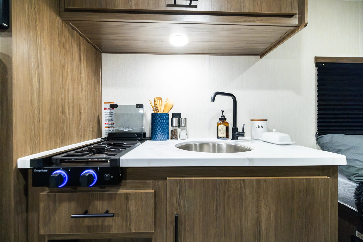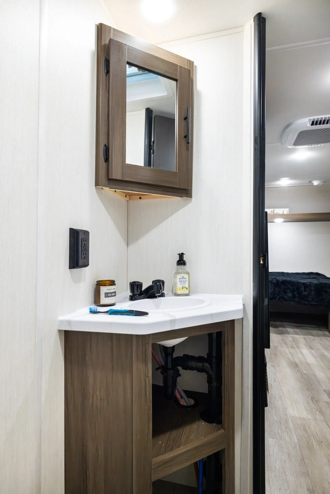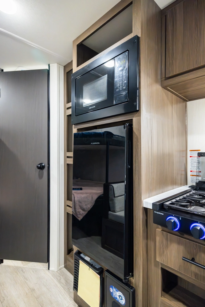 The 17DBX is packed with features. The Camp queen bed up front features a nightstand and shelf above. The kitchen provides a booth dinette, large farmhouse stainless steel sink, and modern appliances, while the rear bunkhouse gives you large double over double bunks for additional flexibility and comfort.