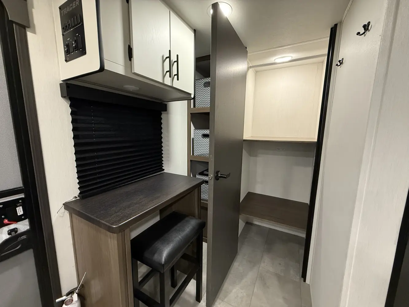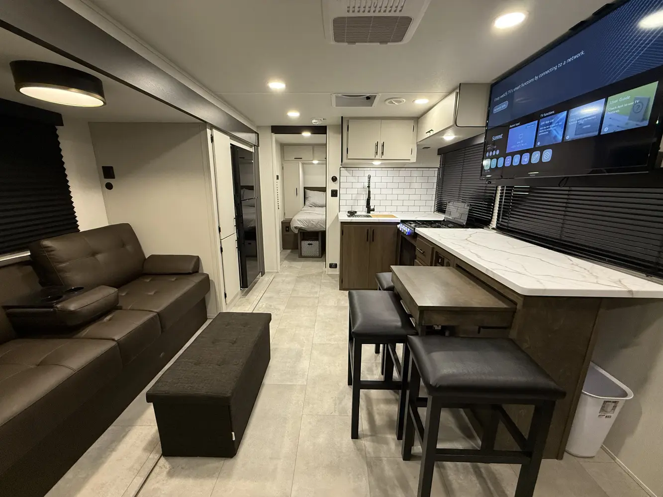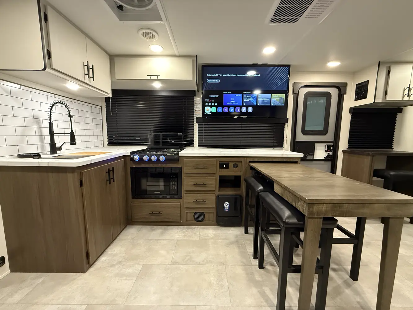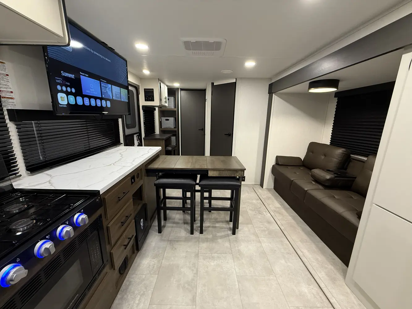 The Tracer 255DS is a unique and compact option for couples and solo campers alike. The modular design of the kitchen dinette allows for it to expand into more countertop space or seating for 4. You also get washer/dryer prep and a desk in a package under 30 ft!